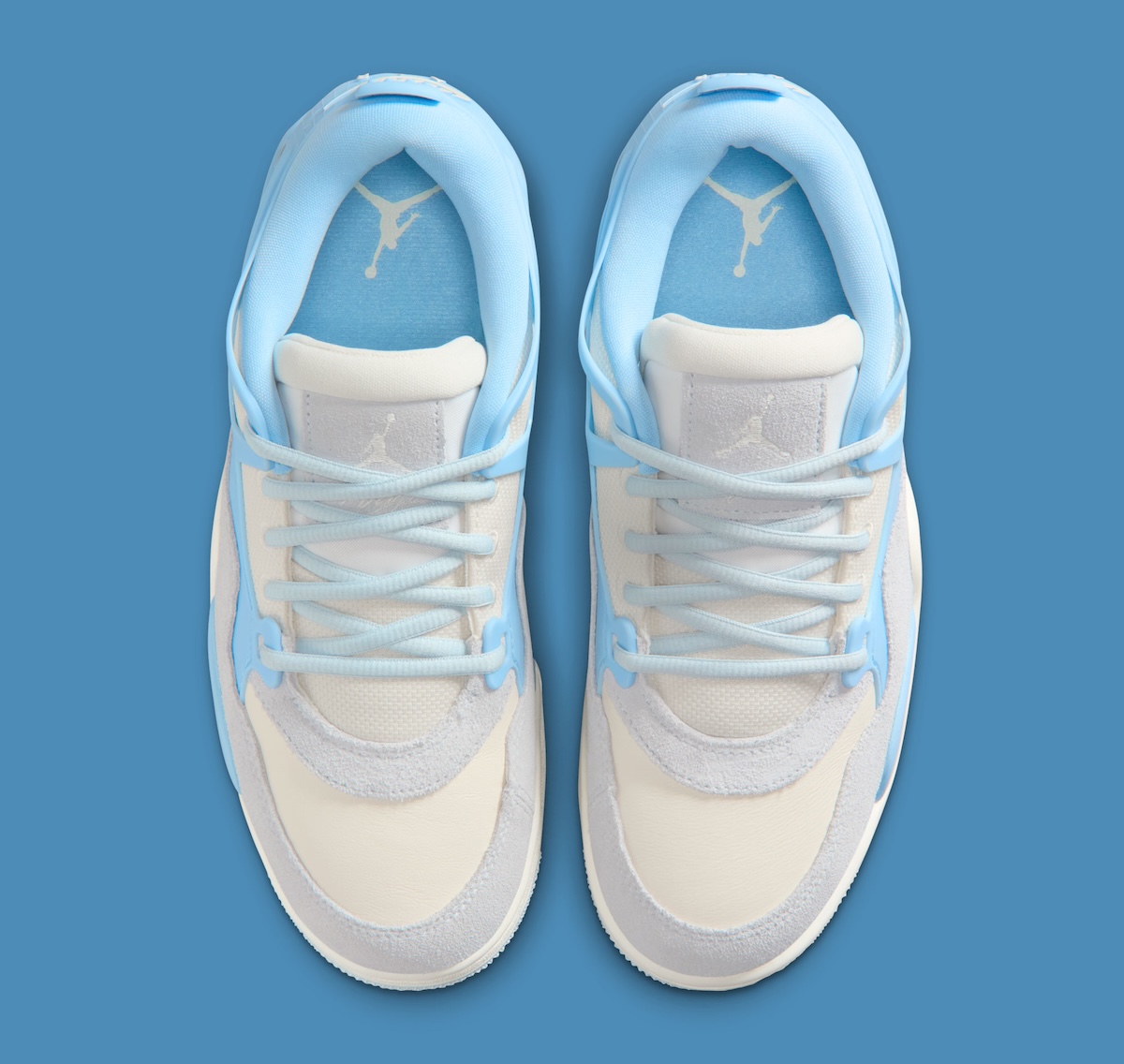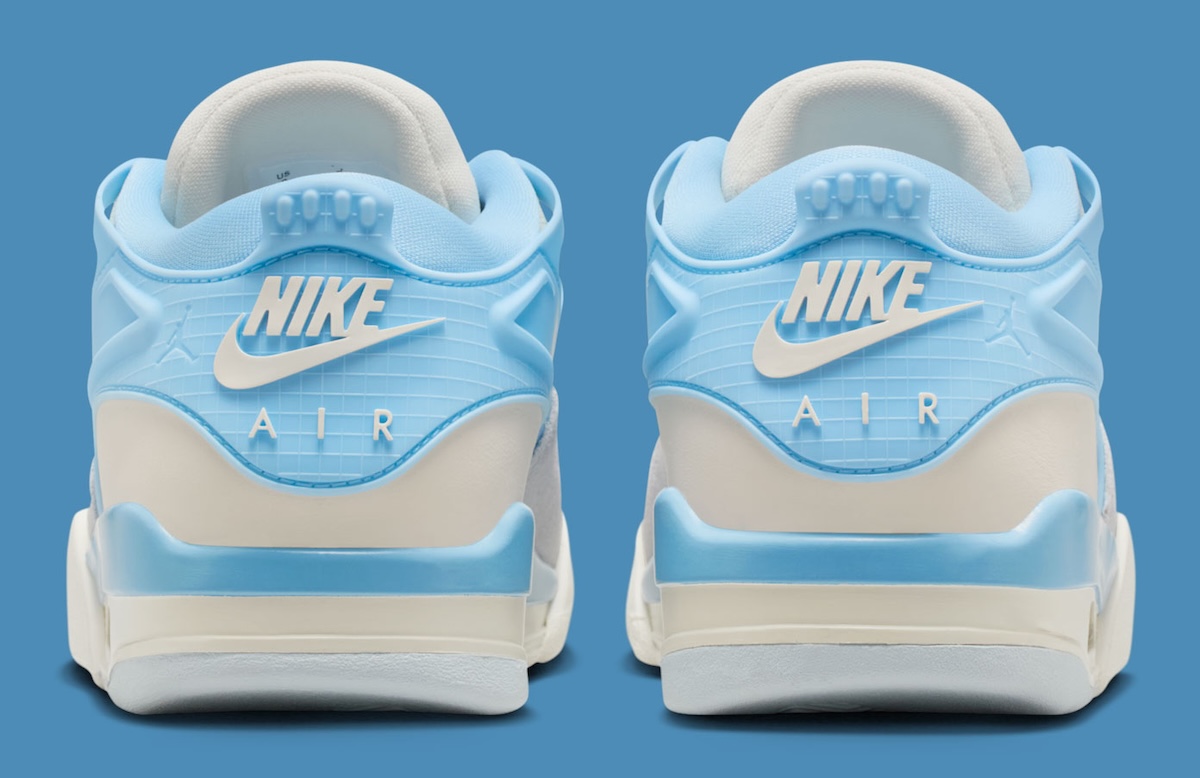 Underfoot, a Pale Ivory and Psychic Blue midsole houses the exposed heel Air unit. The outsole blends Aura and pale blue rubber in a modified herringbone pattern. The padded Aura tongue carries a tonal Jumpman, while the sockliner returns to Psychic Blue with a white logo inside. The design reads more lifestyle than performance, signaling a quieter direction for the RM line.
