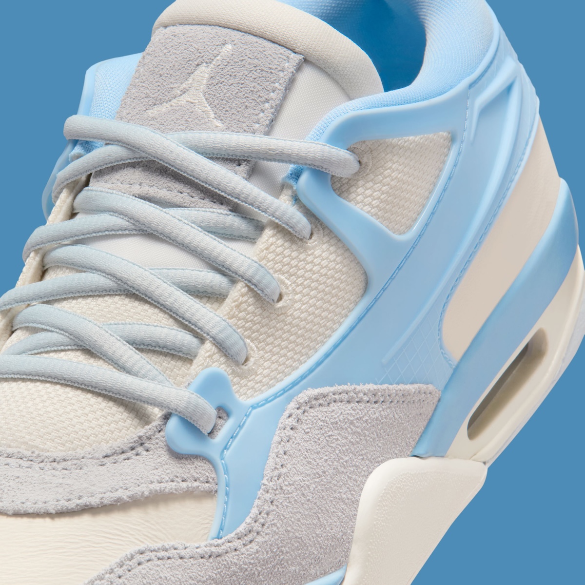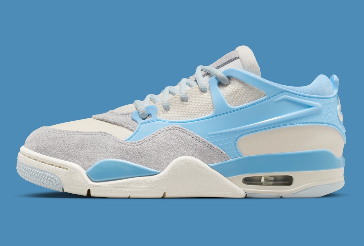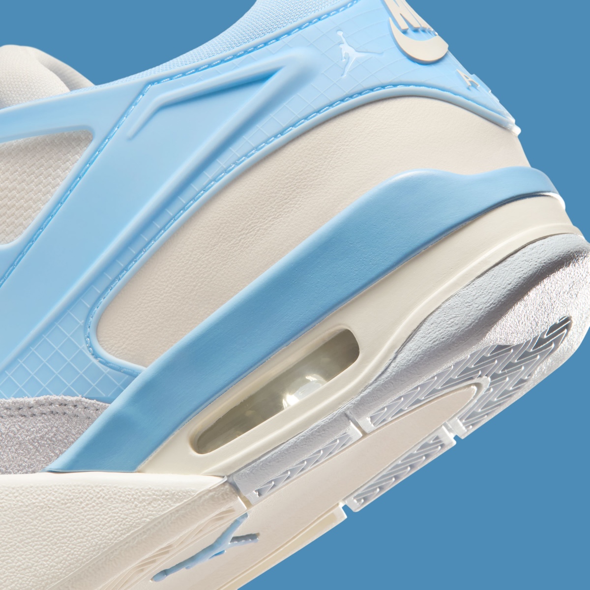The Air Jordan 4 RM “Psychic Blue” uses breathable Pale Ivory mesh across the midfoot. Plush Aura suede frames the toe and lower quarters. Glossy Psychic Blue TPU wings stretch from midfoot to heel, doubling as eyelet supports. A faint grid texture sits beneath the “NIKE AIR” mark on the back, keeping branding sharp but controlled.