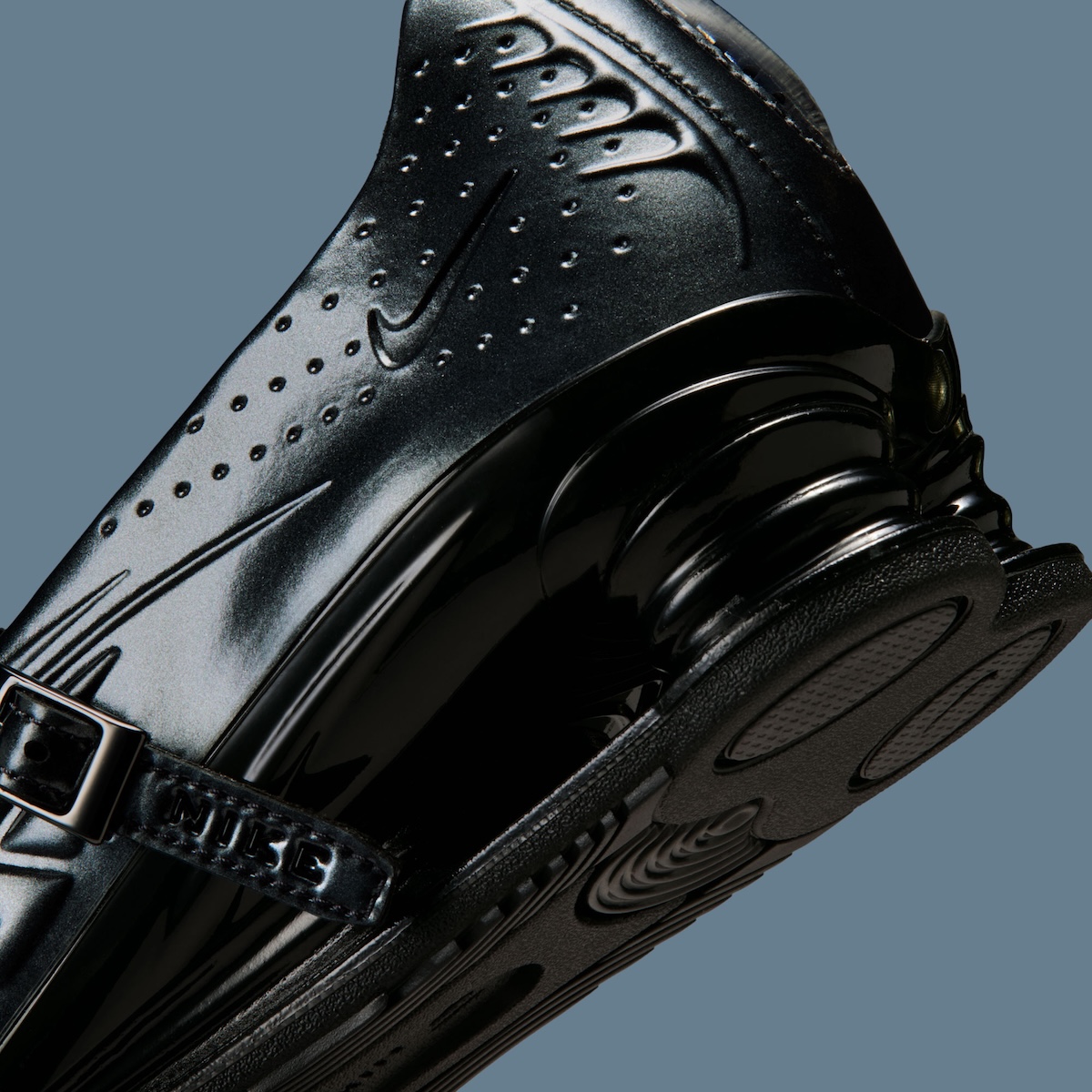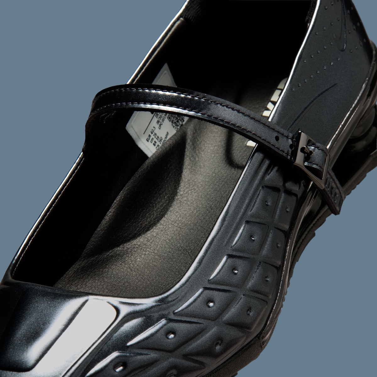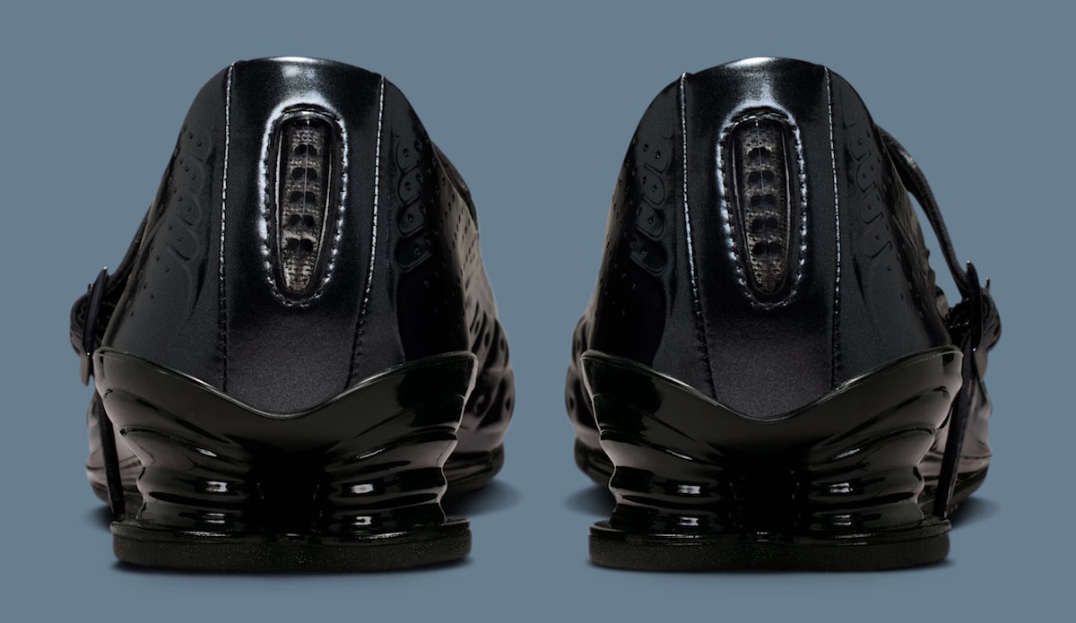 Seen at first it’s deceivingly simple. Then texture starts to pop. Glossy black on the upper finishes it off, but it’s those molded creases up and down the forefoot that demand attention. It has a rigid feel to it as if they pressed it on rather than constructed it pieced by piece. Cut outs pepper the sides and heel ever so slightly to give it some separation. But the strap is what takes it over the edge. It offers a whole new fit while muting the silhouette from looking strictly athletic.