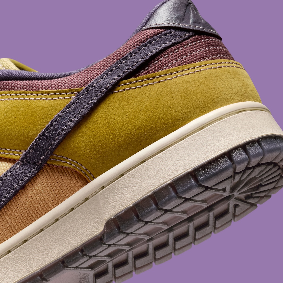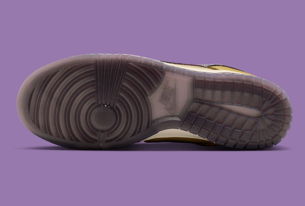 Light Gold covers most of the upper, setting a warm base. Dark Raisin lands on the Swoosh, lining, and heel, adding contrast. A semi-translucent outsole finishes the look with a smoky tone underneath.