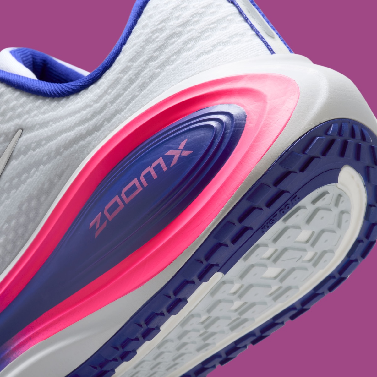 Subtle texture across the upper keeps the build lightweight, supported by a soft grey Swoosh that avoids overpowering the palette. Underfoot, the oversized ZoomX platform carries most of the visual weight, blending blue into pink through a smooth gradient. A circular 1–12 hangtag adds a layer of curiosity, suggesting a possible broader rollout tied to the Vomero Plus line.