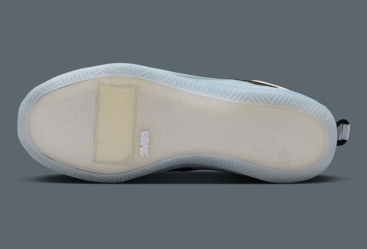 Underfoot, the design shifts into a more aggressive direction. A translucent icy blue midsole extends upward with carved-out sections, exposing internal structure while reducing weight. Zoom Air cushioning sits within the setup, and a herringbone outsole pattern handles traction duties for game-ready movement.