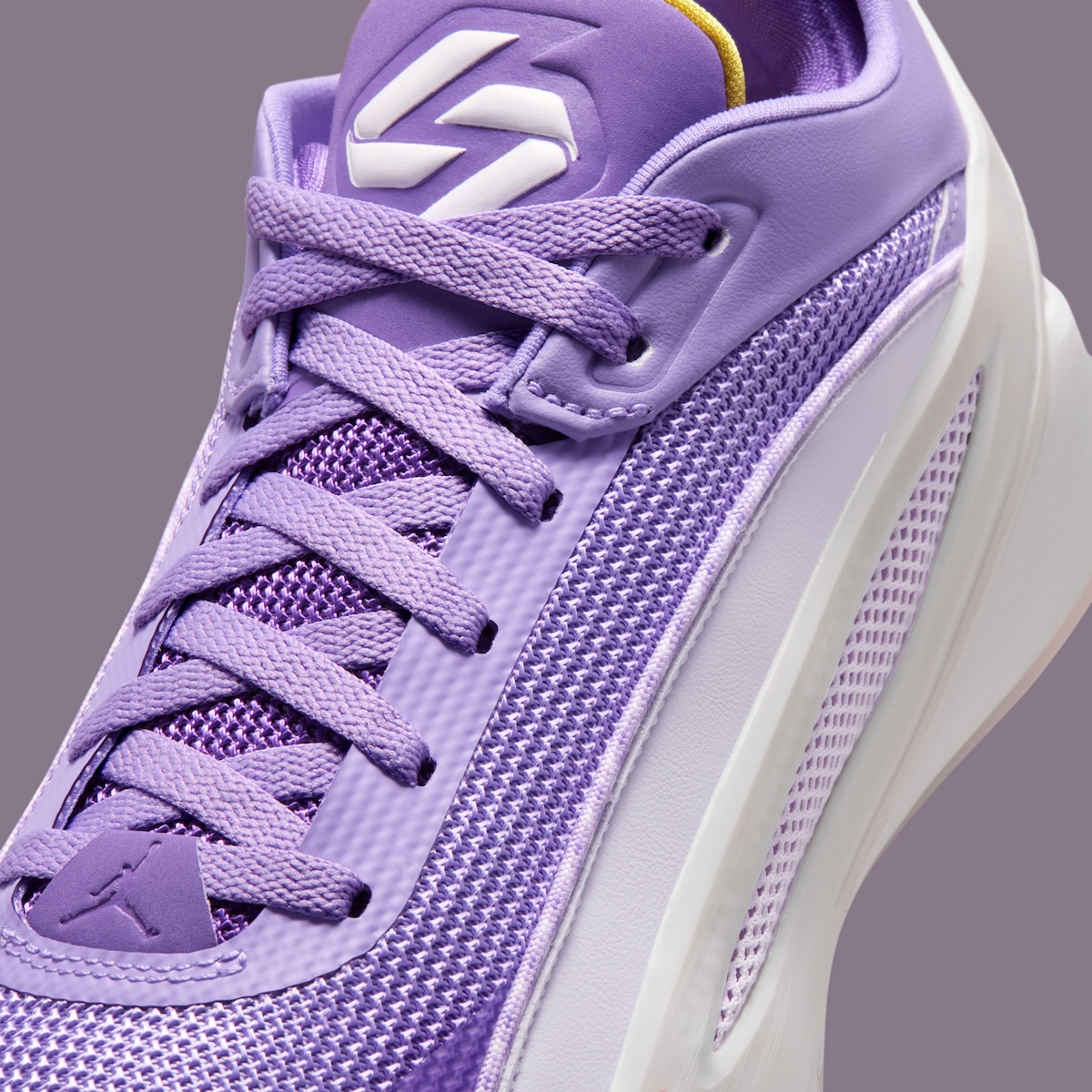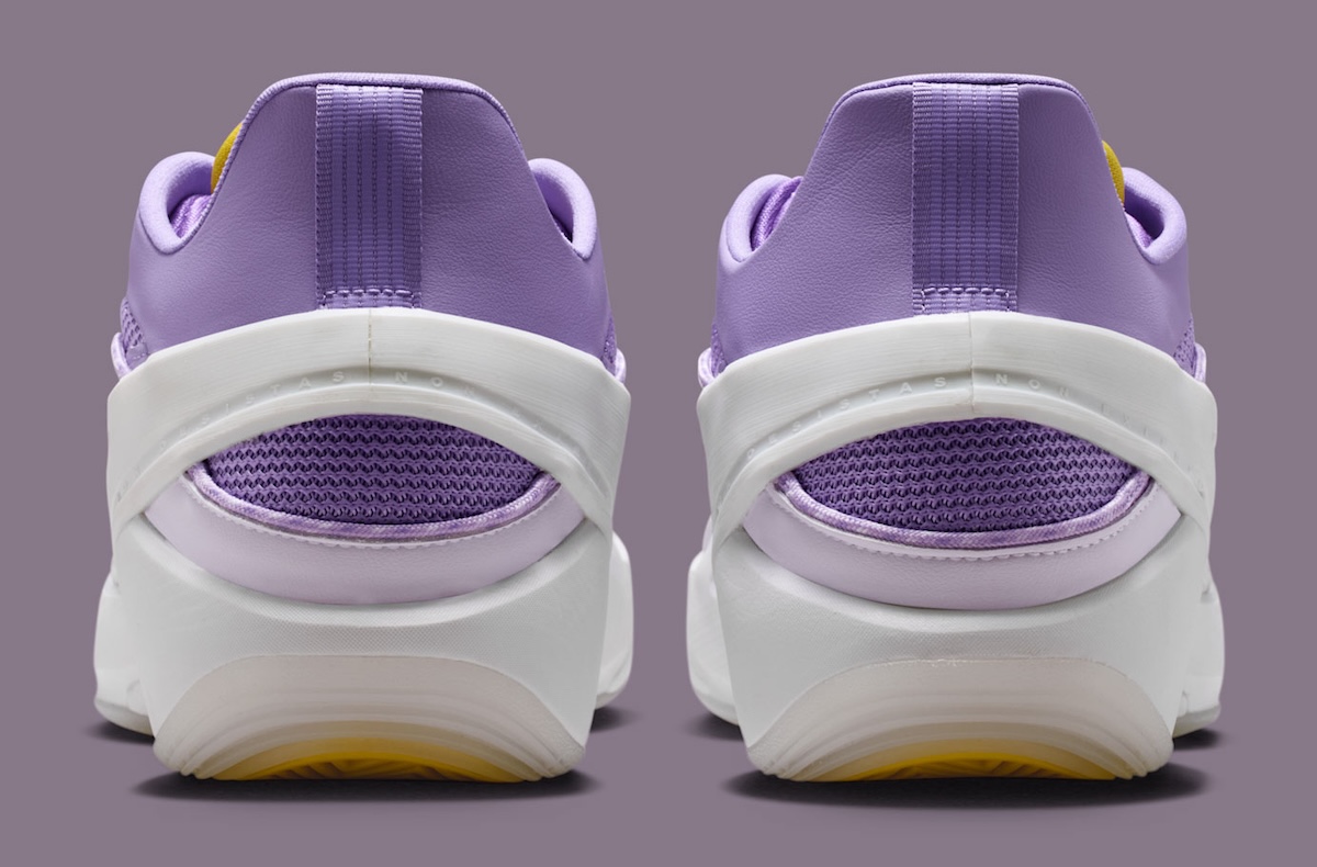 Wrapping around is a molded white midsole, shaping a low-slung silhouette. Slots cut into the lateral side display mesh detail underneath. Touches of gold sit hushed down low by the forefoot with a tiny Jumpman, representing the Lakers aesthetic.