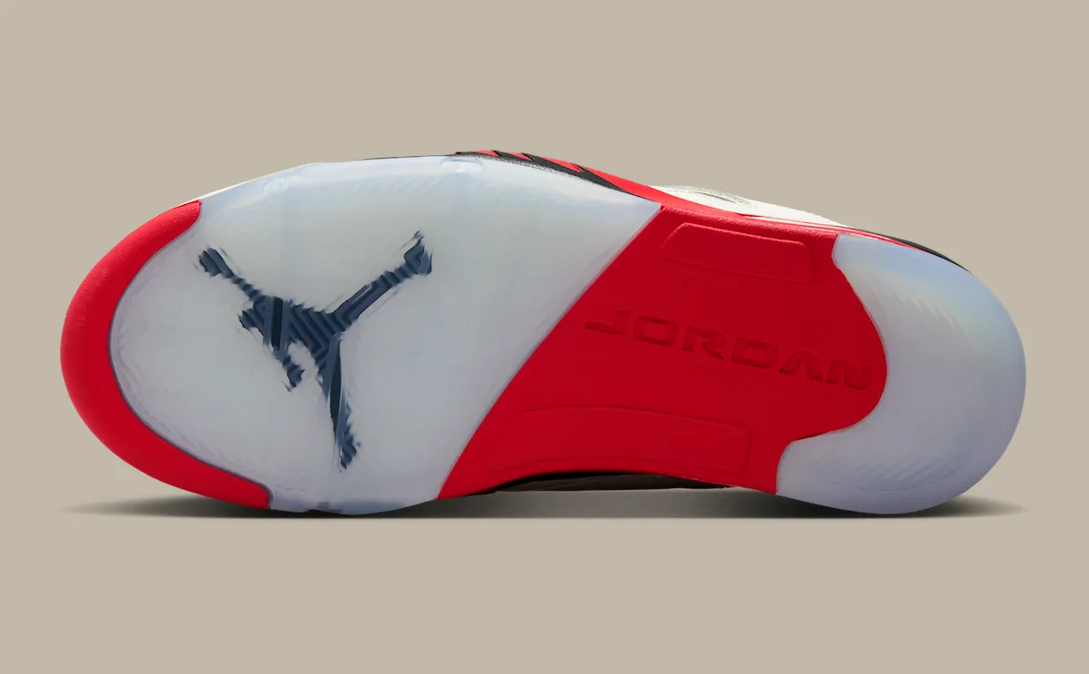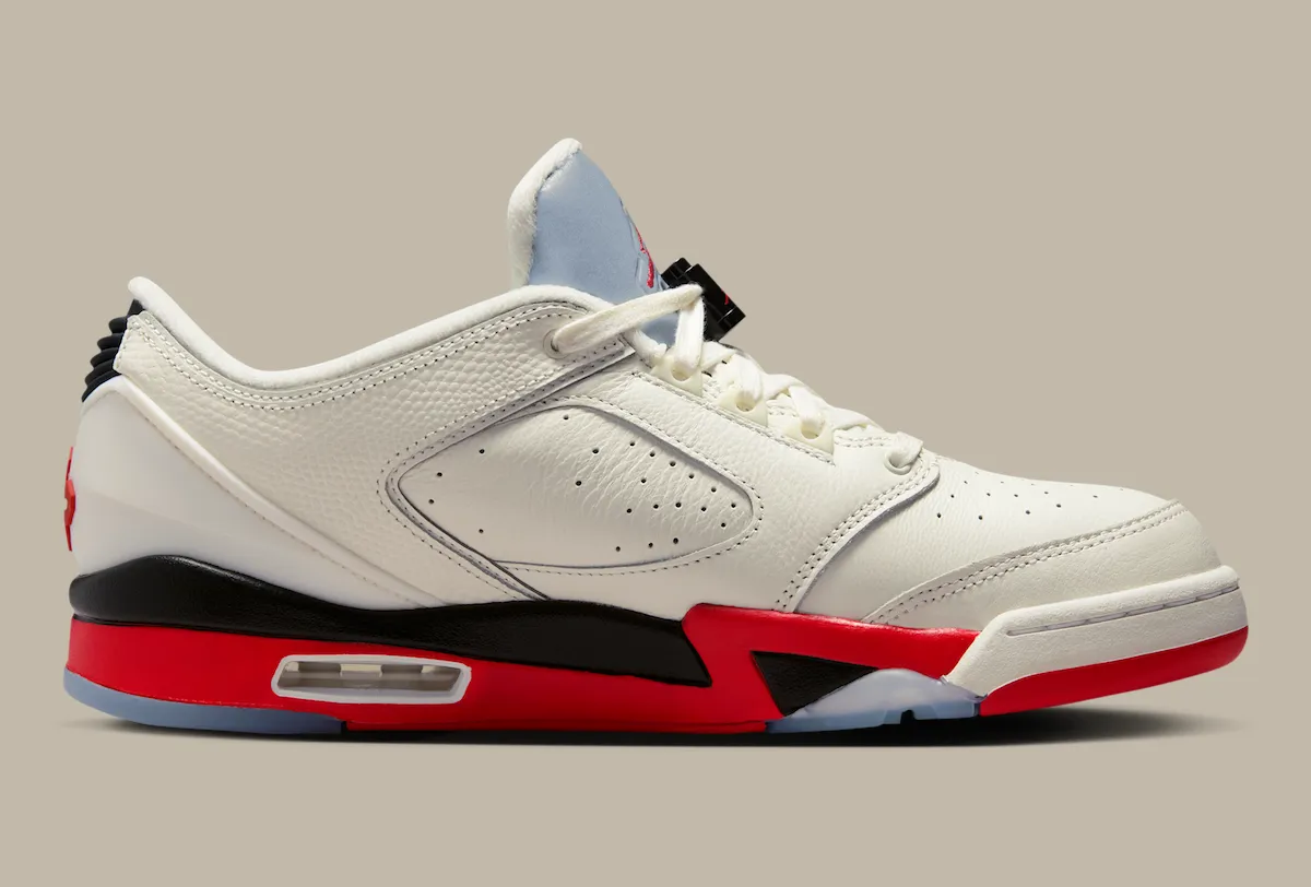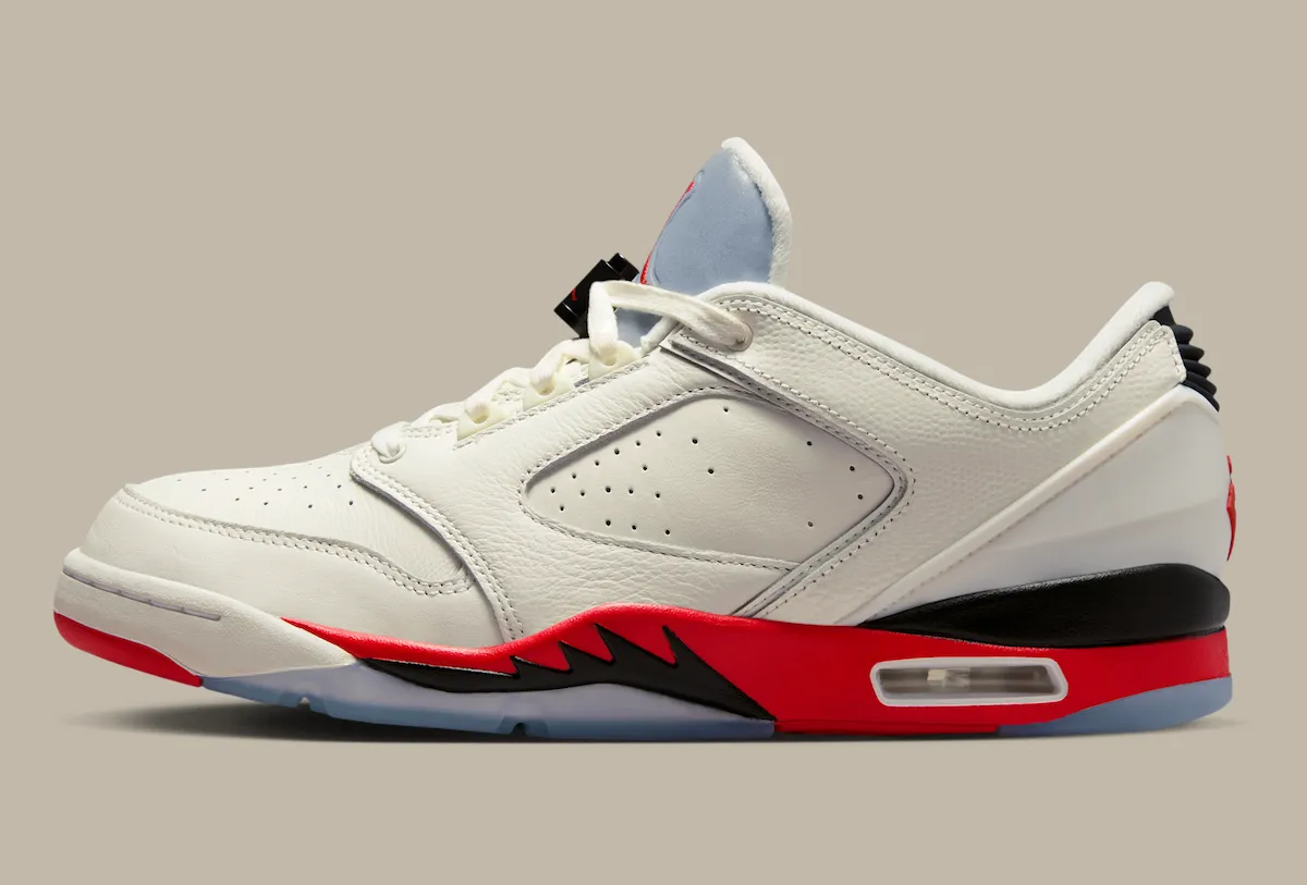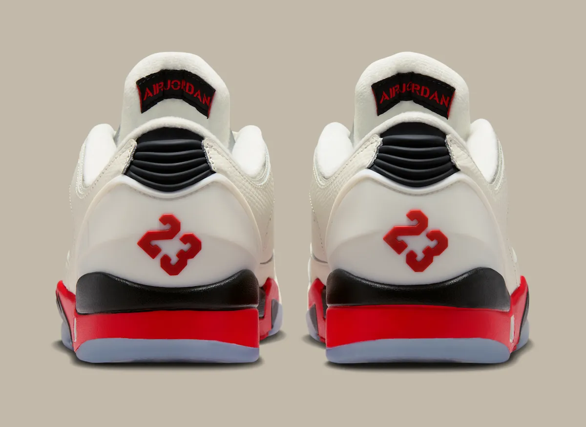 This updated low-top version stays true to that DNA while leaning heavily into Air Jordan 5 influence. The “Fire Red” accents, jagged midsole detailing, and visible Air unit create a strong visual connection, making it easy to mistake for a modified AJ5 at first glance. At the same time, the build pulls in recognizable cues from other classics, including the Air Jordan 1-inspired toe box, Air Jordan 2-style lace loops and heel structure, and the signature “23” branding from the Air Jordan 7.