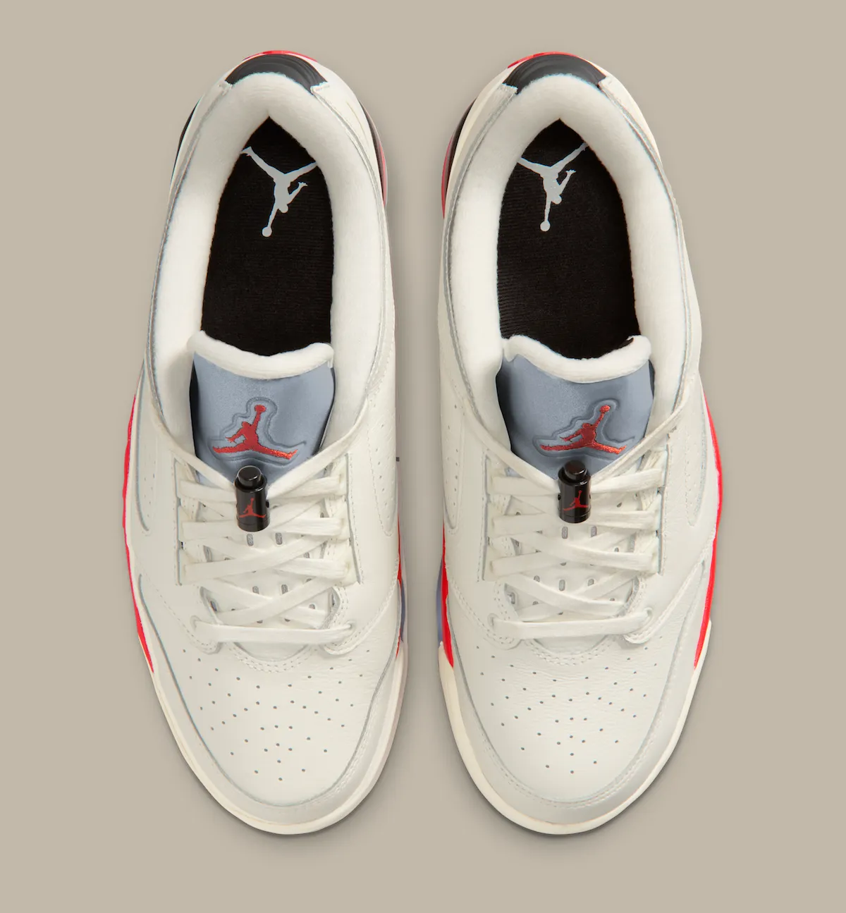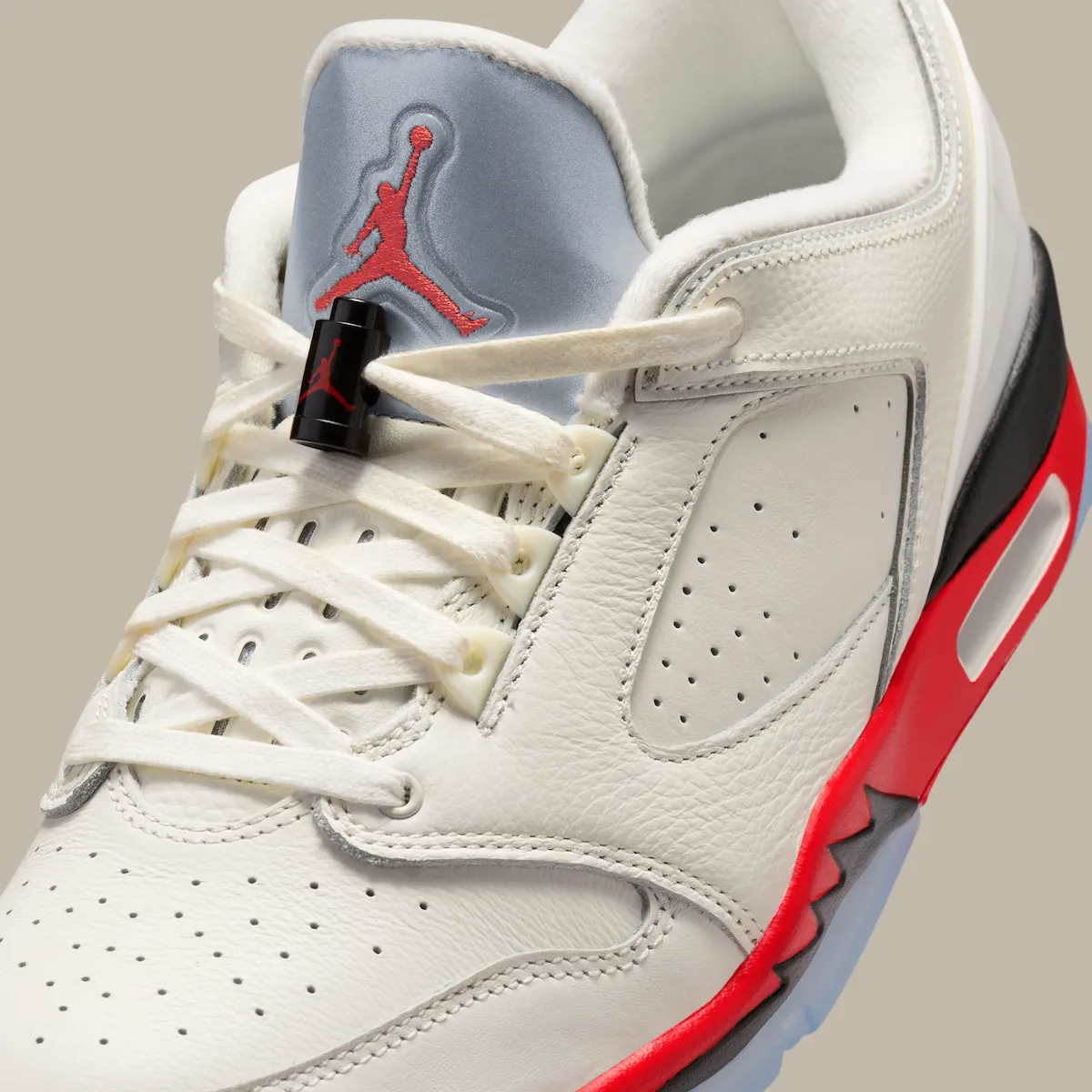 The upper arrives in a soft Sail finish, giving the shoe a more lifestyle-friendly look, while bold red hits across the midsole and outsole bring contrast and energy. Icy outsole sections and classic Jumpman branding round out the design.