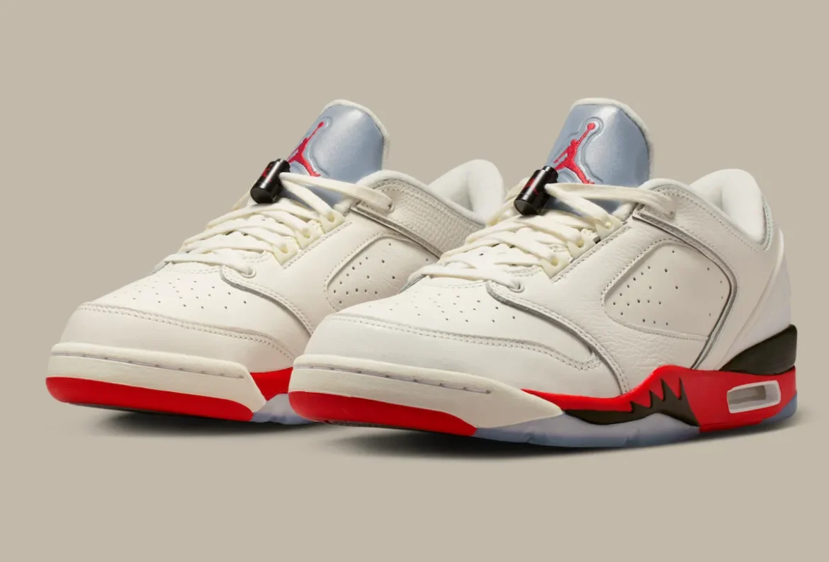 This updated low-top version stays true to that DNA while leaning heavily into Air Jordan 5 influence. The “Fire Red” accents, jagged midsole detailing, and visible Air unit create a strong visual connection, making it easy to mistake for a modified AJ5 at first glance. At the same time, the build pulls in recognizable cues from other classics, including the Air Jordan 1-inspired toe box, Air Jordan 2-style lace loops and heel structure, and the signature “23” branding from the Air Jordan 7.