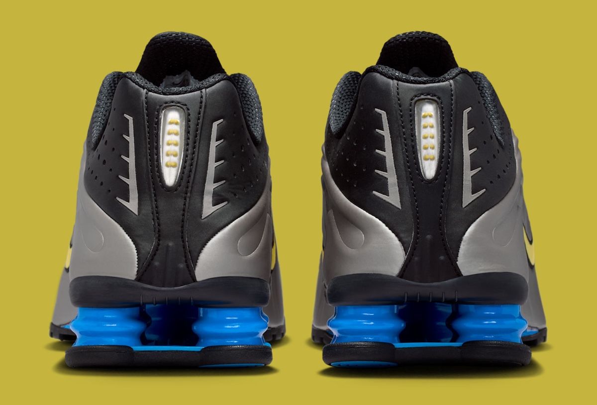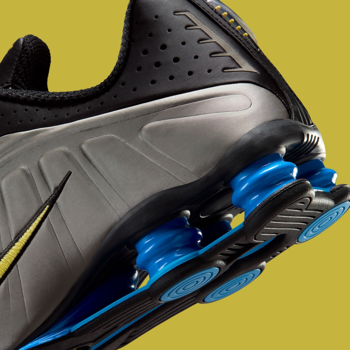 A mix of Black and Metallic Pewter forms the base, giving the upper a clean but structured feel. Perforations across the black panels help with airflow, while the molded pewter sides add depth and shape. The design still carries that futuristic edge that defined the original Shox era.