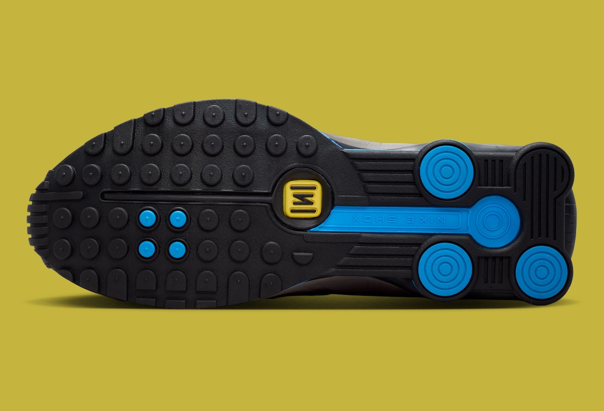 Color does the heavy lifting here. A Canary Swoosh cuts through the neutral tones, while Light Photo Blue Shox columns underfoot add contrast and energy. The blue support plate ties it together, and the black outsole keeps everything grounded with durable traction.