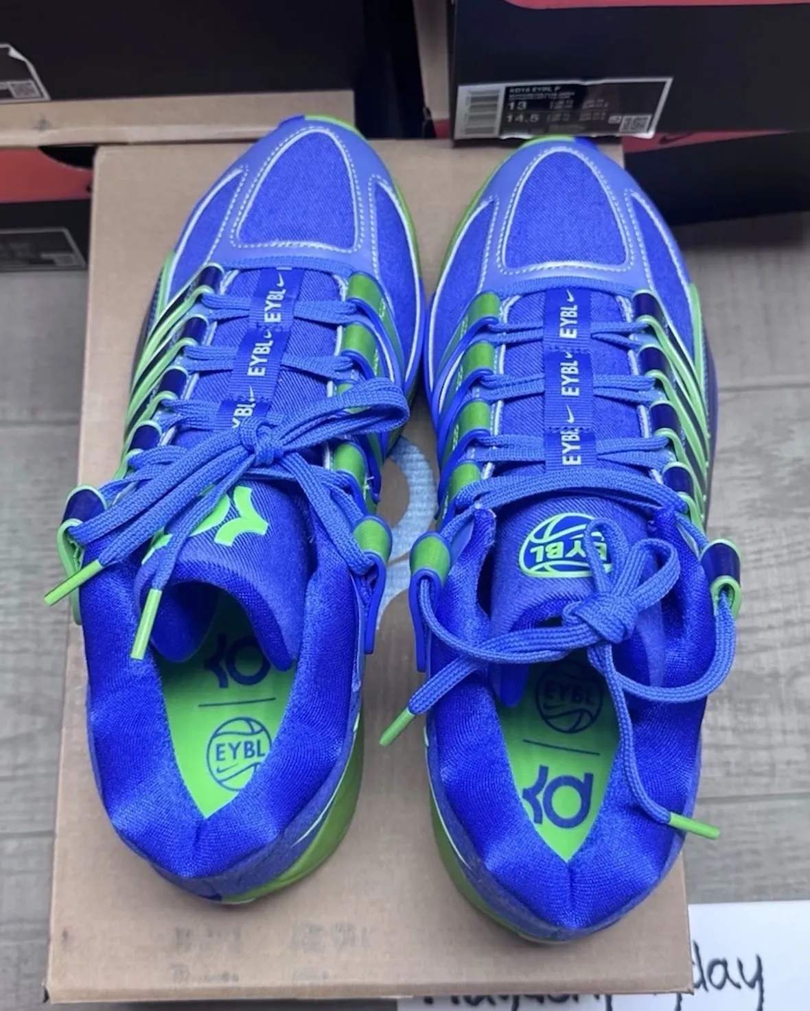 EYBL branding remains a key detail throughout. The tongue features vertical EYBL tags, while the signature circular logo appears on one shoe, balanced by KD branding on the other. These details reinforce the pair’s connection to the elite youth league and its on-court presence.