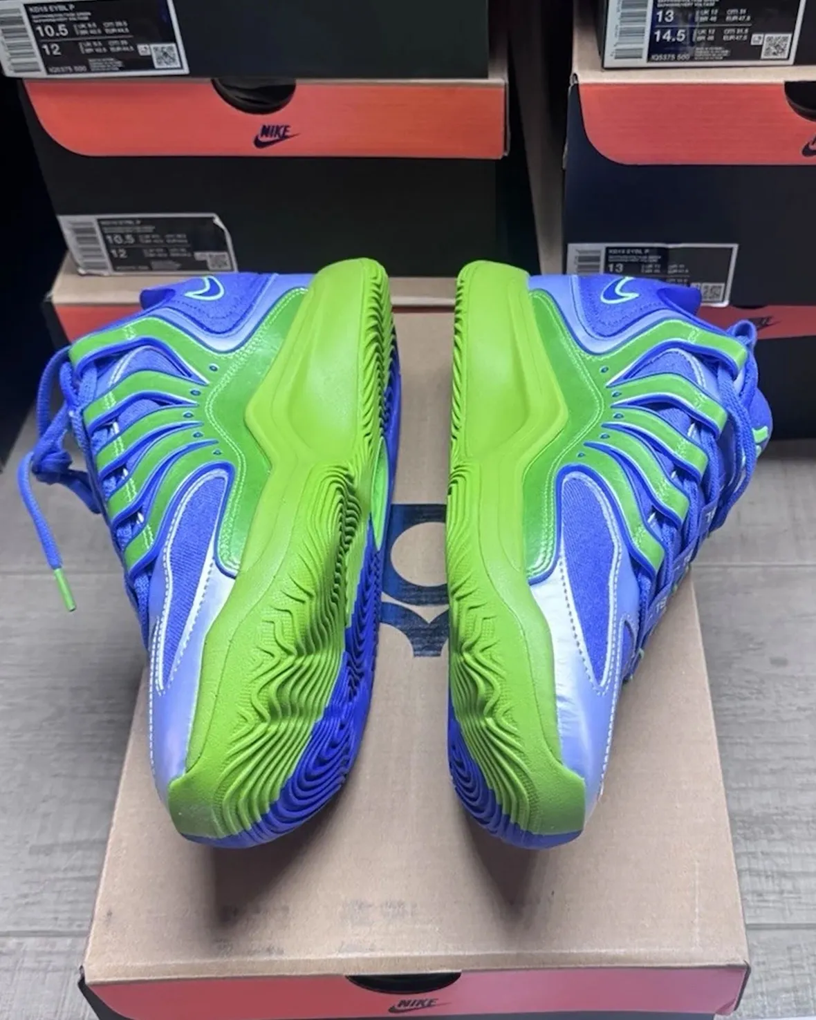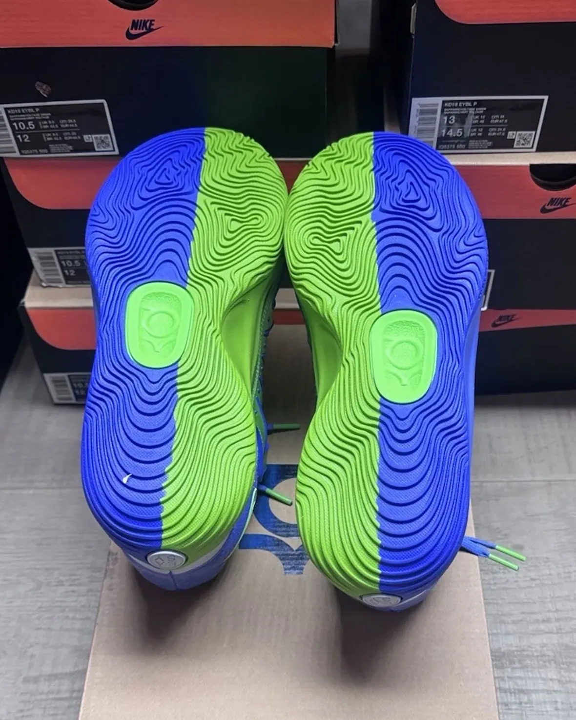 As expected, the circuit also delivers exclusive footwear, and the Nike KD 18 “EYBL” continues that tradition. This player-exclusive release leans into a bold mismatched design, pairing a light green and royal blue outsole for a split-color effect. The upper follows that same theme, with contrasting tones applied across the lateral and medial sides, creating a standout look inspired by trail-style elements.