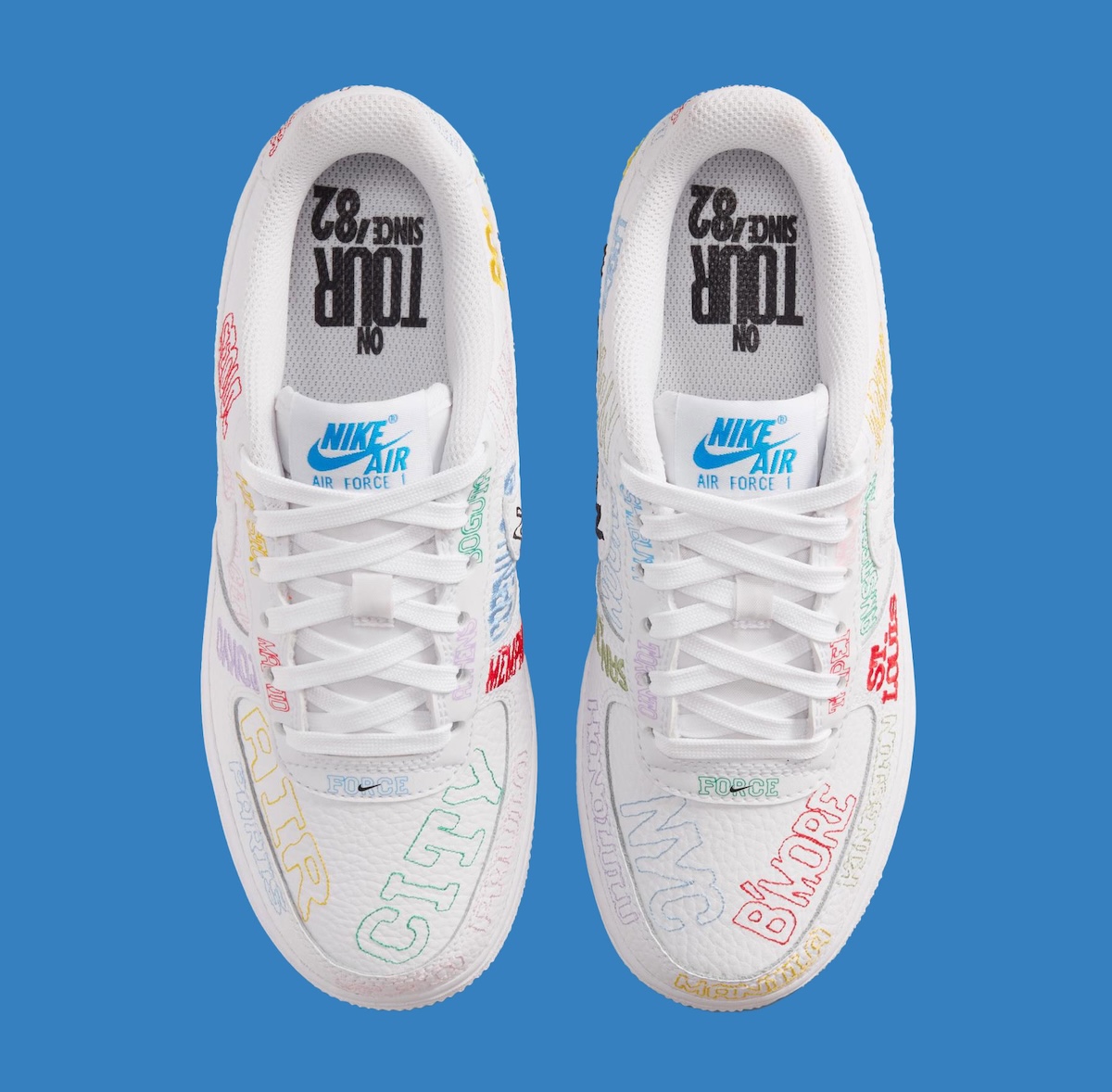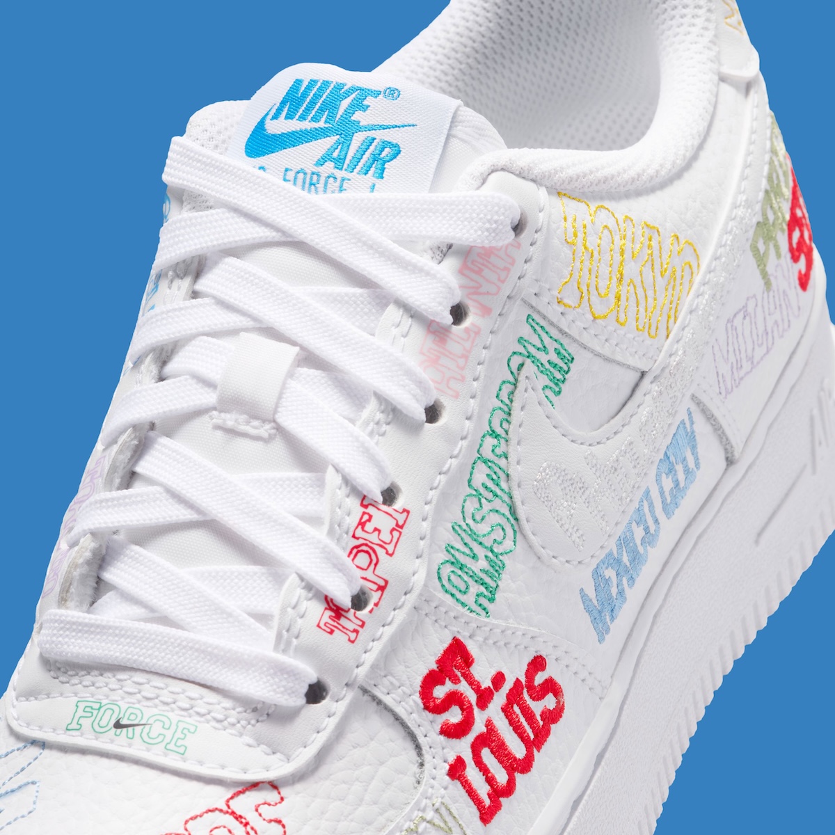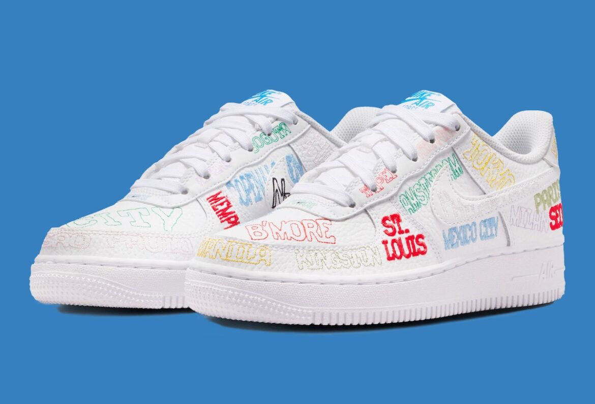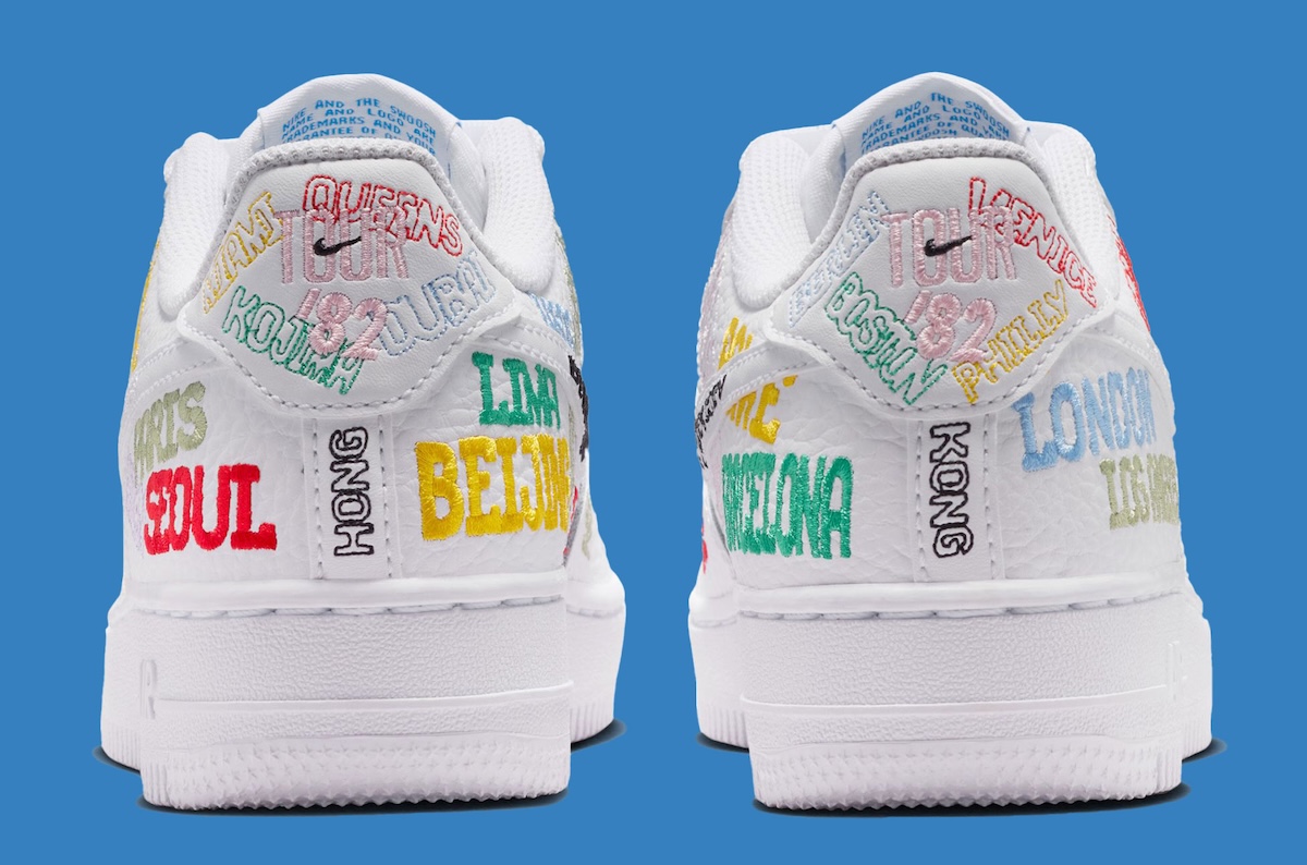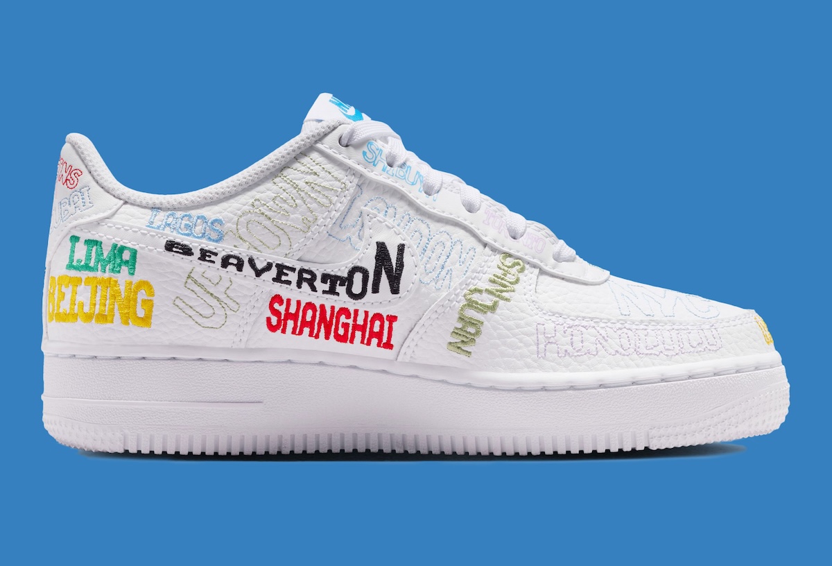 A white tumbled leather upper sets a clean base for the design. From there, embroidered city names take over across the panels. You’ll find Shanghai, Paris, Seoul, and Mexico City among them. Each name uses its own color and style, which adds variety without clutter. Beaverton is included as well, tying everything back to Nike’s roots.