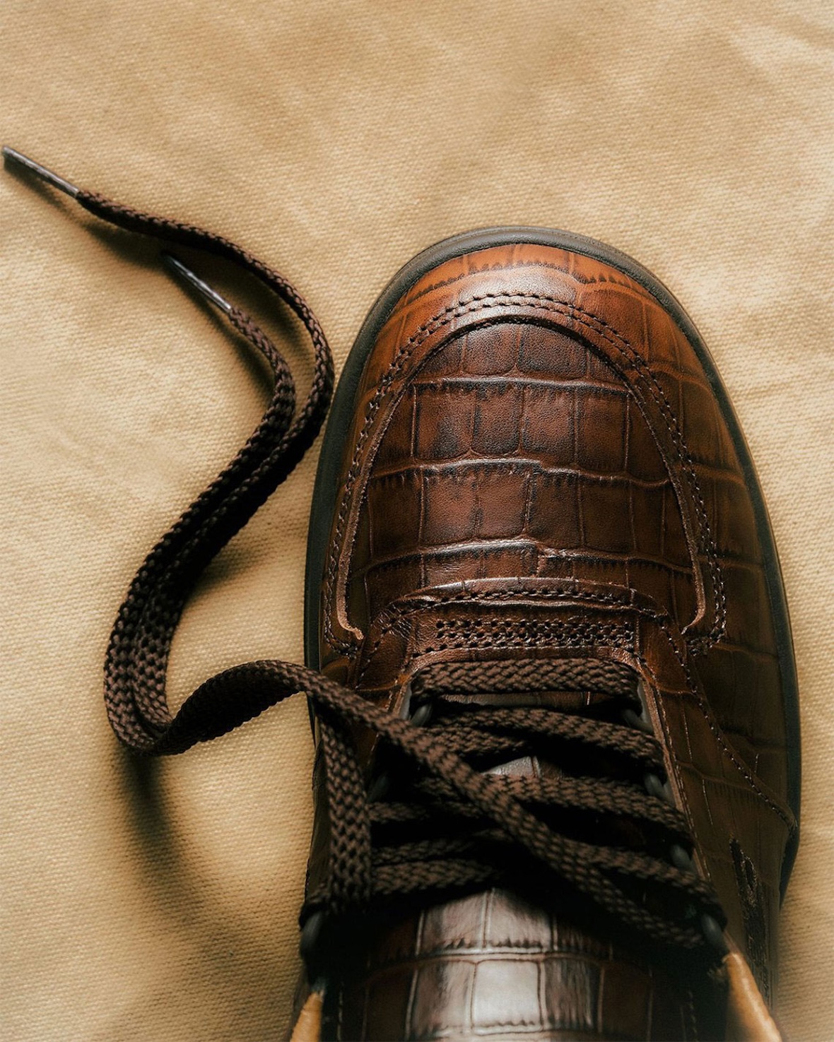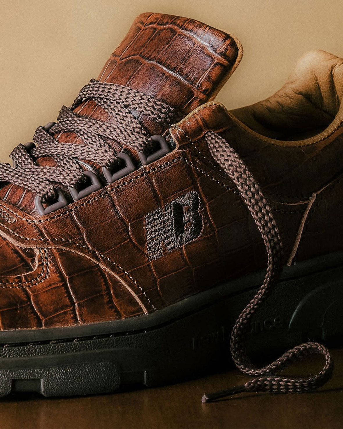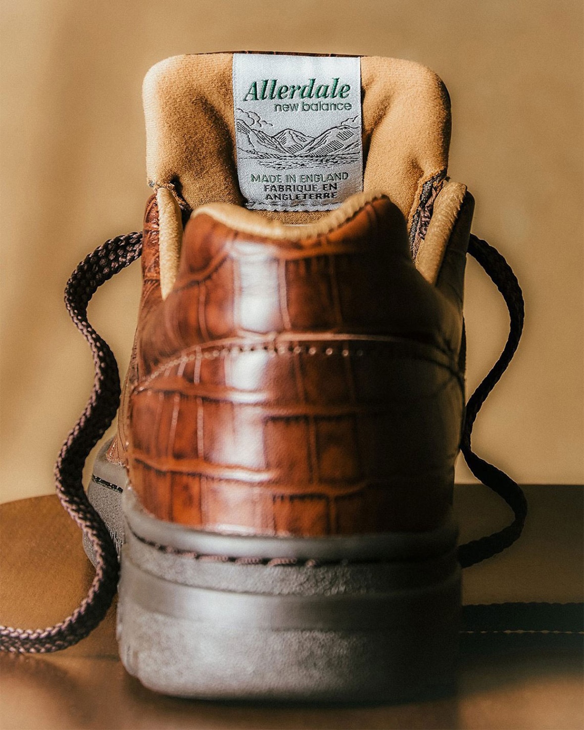 Deep brown croc-embossed leather covers the upper, providing richness and detail without excess. The leather features a slight shimmer across the embossed design and the stitching/NB logo embroidery are kept relatively toned down. Thick rope style laces and a plush tan leather lining inside continues the elevated theme of this Allerdale.