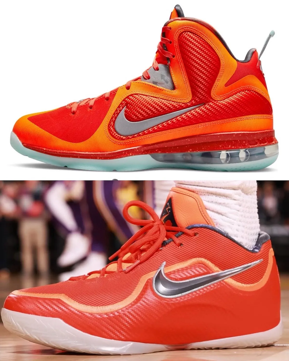 The sneaker arrives in a bold two-tone orange upper, highlighted by brighter accents on the tongue and detailed stitching that separates the crown-shaped lower section from the lighter upper build. Adding to the storytelling, LeBron brings back his original LBJ23 logo on the medial side, reinforcing the self-referential theme behind the design.