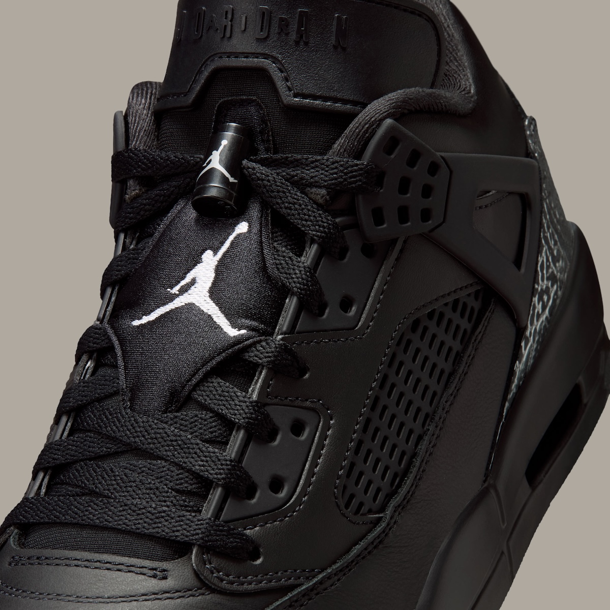 Those patterned mudguards bring contrast without disrupting the model’s understated direction. Sitting beneath them is a solid black midsole with a visible Air unit in the heel, grounding the Jordan Spizike Low Black Silver with familiar Jordan cushioning. Matte TPU wings along the sides echo Air Jordan 4 DNA, while a small lace lock with a white Jumpman adds a quiet focal point.