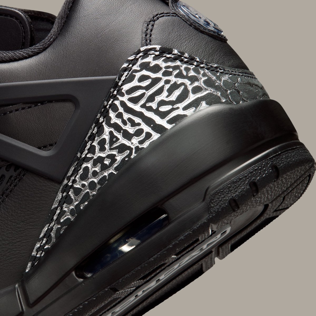 Black leather is utilized on the toe box, eyestays, collar, and heel to build a blank canvas. Ventilated midfoot panels introduce subtle texture while maintaining the all-black theme. This colorway then shifts attention toward the toe and heel, where classic elephant print overlays appear in a sharp Black and Metallic Silver finish.