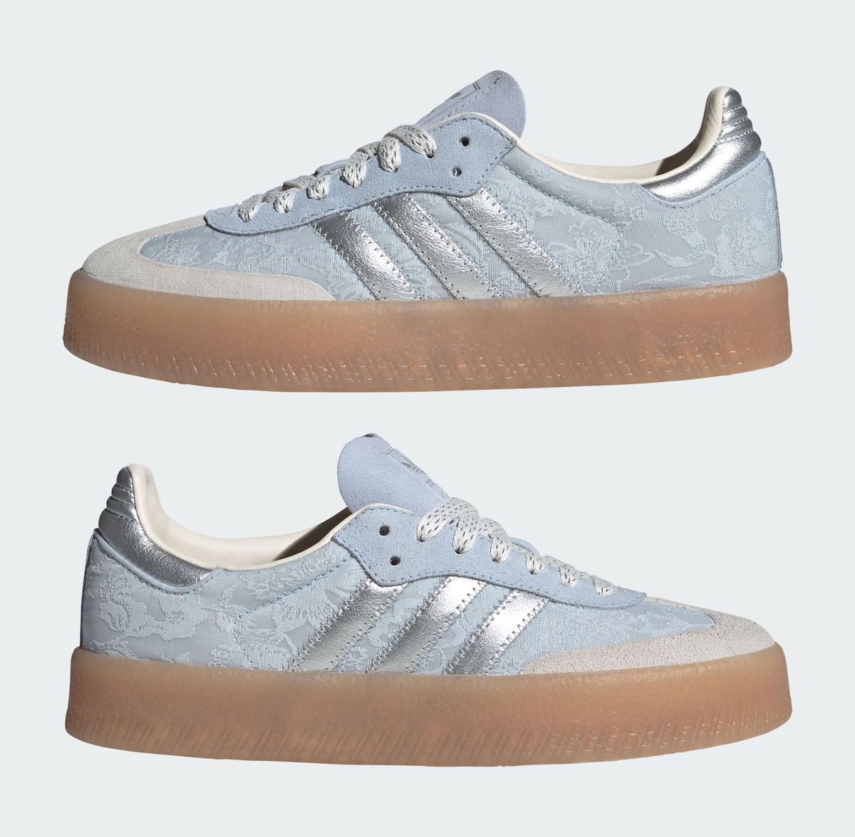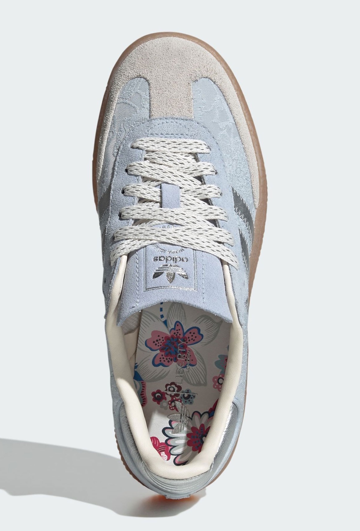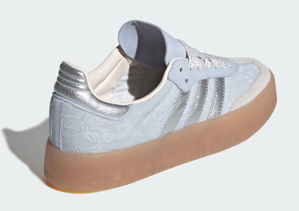 The Sambae approaches the palette a little differently. While the silver branding stays in place, the suede toe shifts to a creamy off-white instead of blue. That change gives the pair a softer contrast and makes the Delftware floral fabric stand out more clearly.