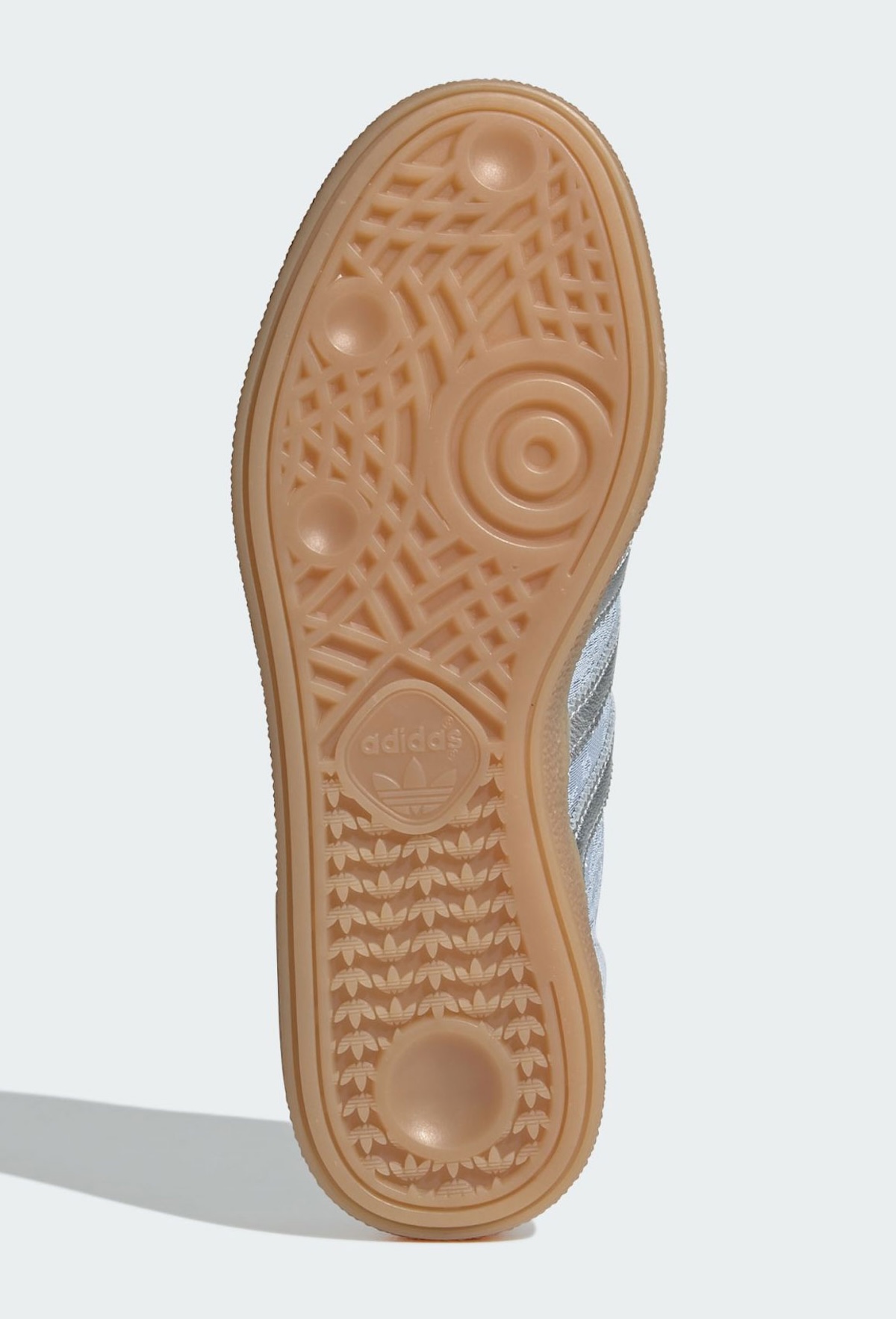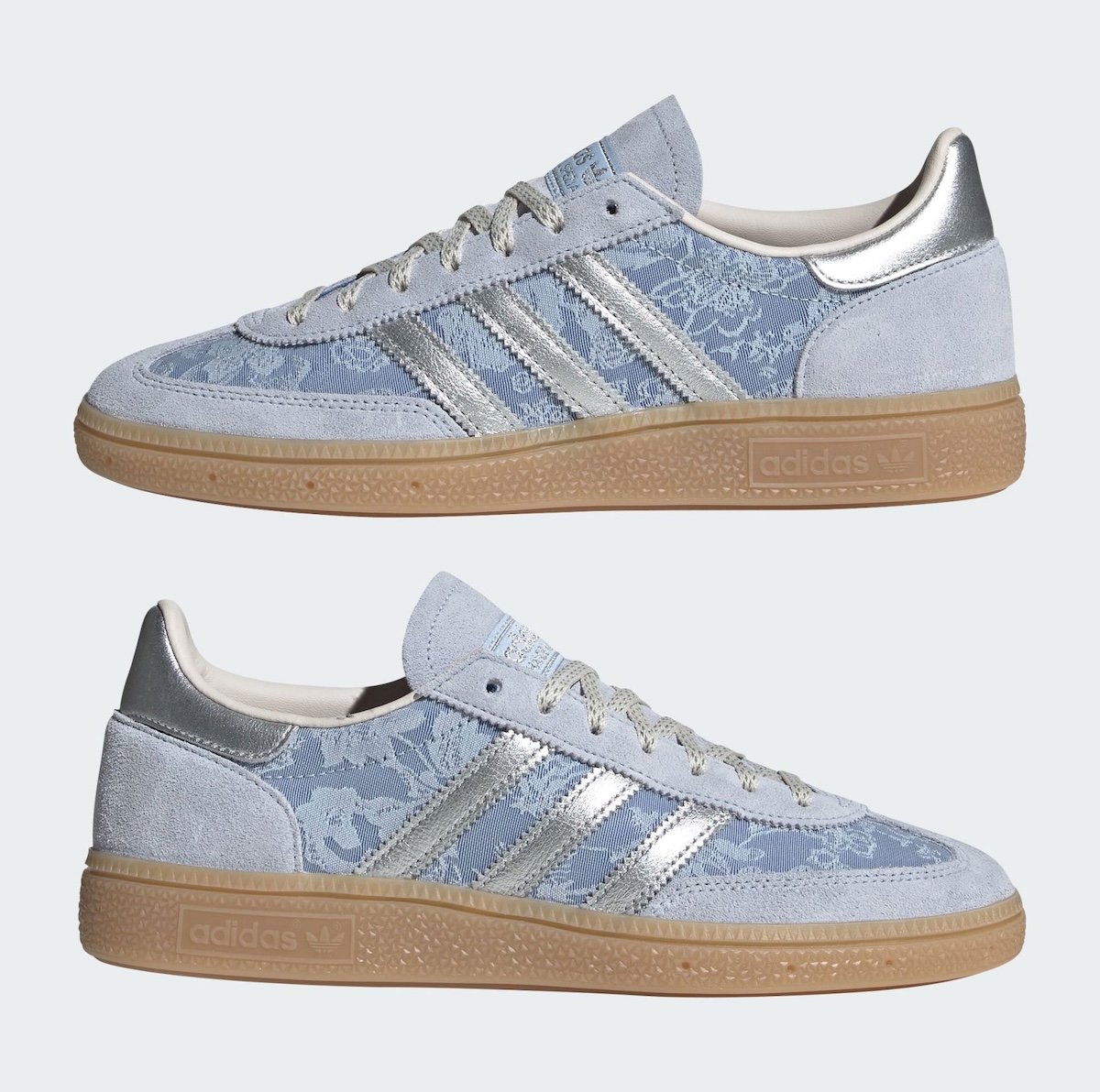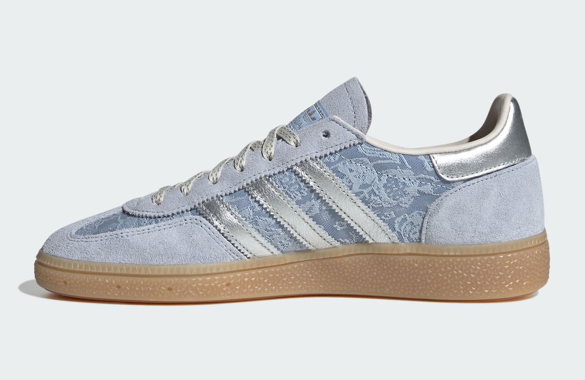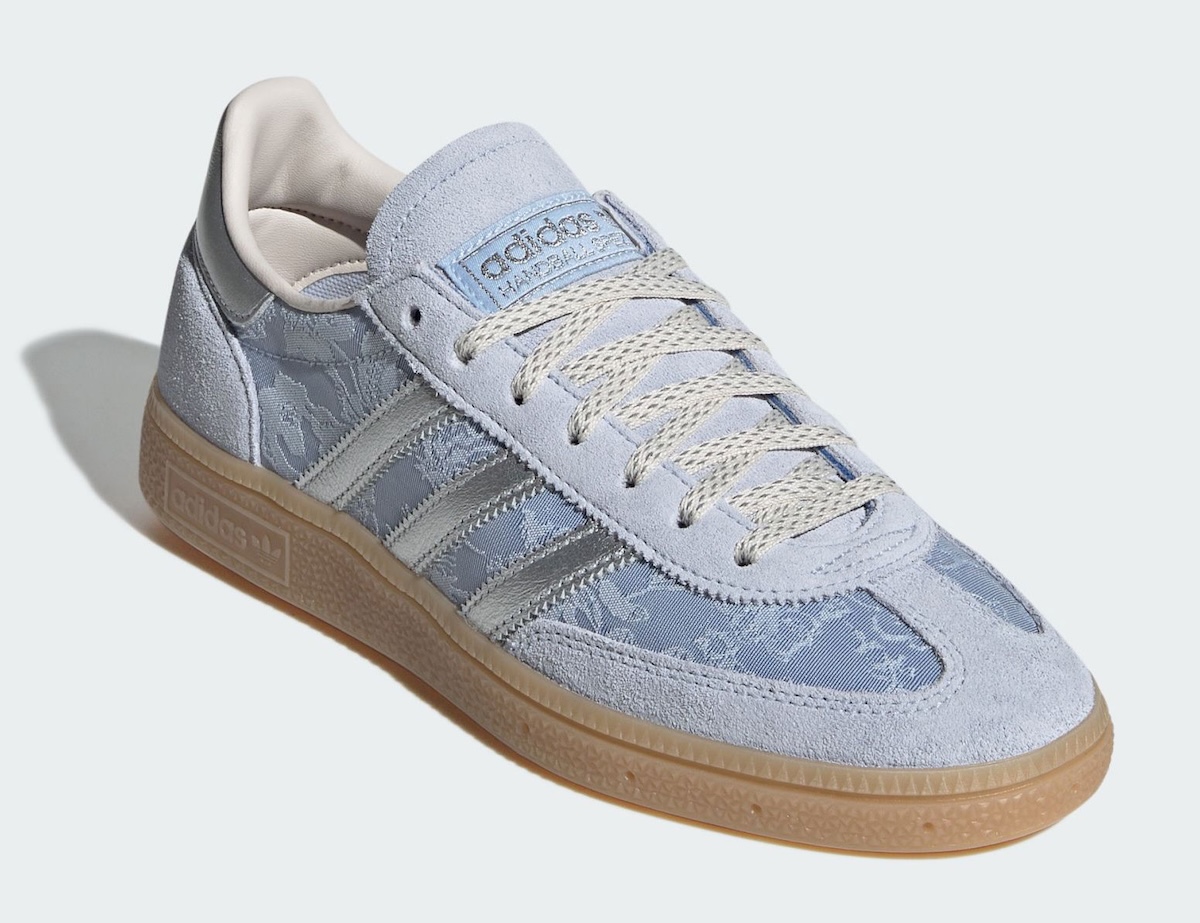 On the Handball Spezial, soft light blue suede runs across the toe, eyestay, and heel. The tone stays consistent across the upper, letting the patterned panels take attention. Silver Three Stripes and heel branding break up the softness with a slight metallic shine.