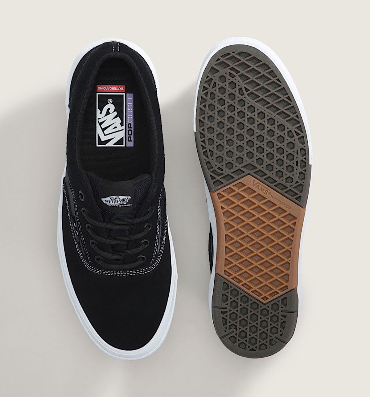 The familiar Era profile remains intact, but the build underneath it feels more purposeful. Extra padding wraps the collar for a more secure feel, while Vans’ SickStick rubber helps the outsole grip the board with more consistency. Areas that typically wear down fastest are protected by DuraCap reinforcement, and PopCush cushioning underfoot softens hard landings without removing board feel. Small adjustments like these show how Vans continues refining its core skate models rather than redesigning them.