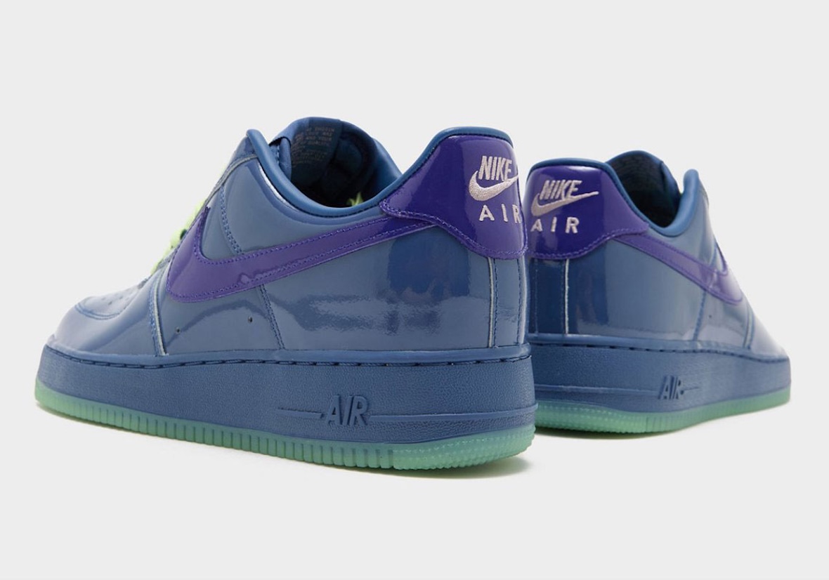 Blue patent leather adorns the upper replacing the regular matte colors. Everything from the perforated toe box to the heel is made with this glossy material. The patent leather finishes shine everywhere giving the sneaker a mirror like effect that changes with reflection. Despite the new leather the iconic AF1 paneling stayed consistent.