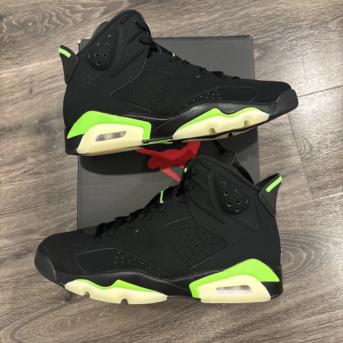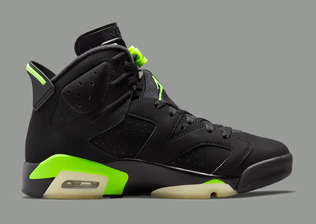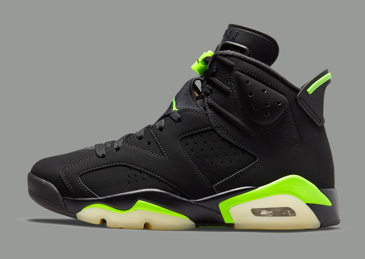 Released in Summer 2021, the Air Jordan 6 “Electric Green” introduced a bold neon-accented take on the classic silhouette. The sneaker officially launched on June 5, 2021, arriving in full family sizing with a retail price of $190 for adult pairs. Its striking black and neon green color scheme helped the release stand out among recent Air Jordan 6 colorways.