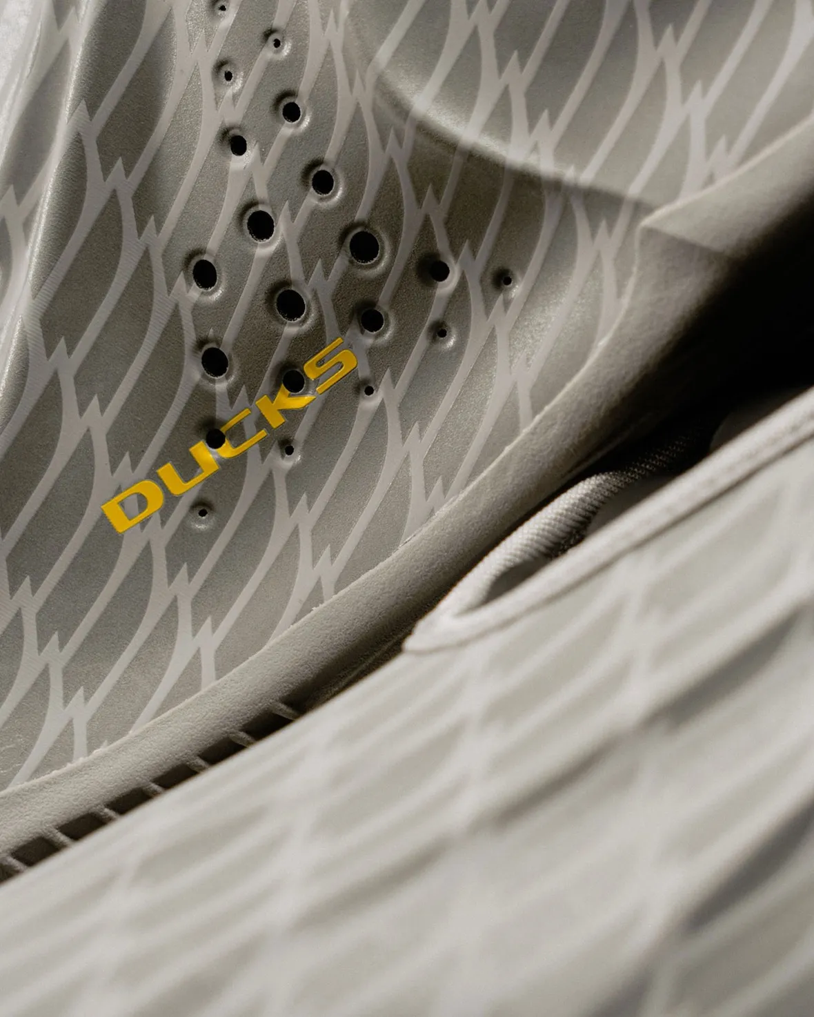 Branding remains minimal but purposeful. Oregon’s recognizable “O” logo is placed on the tongue in black, while “Ducks” lettering in bright yellow appears along the medial side of the shoe. The combination ties directly into the university’s traditional color palette without overwhelming the streamlined silhouette.