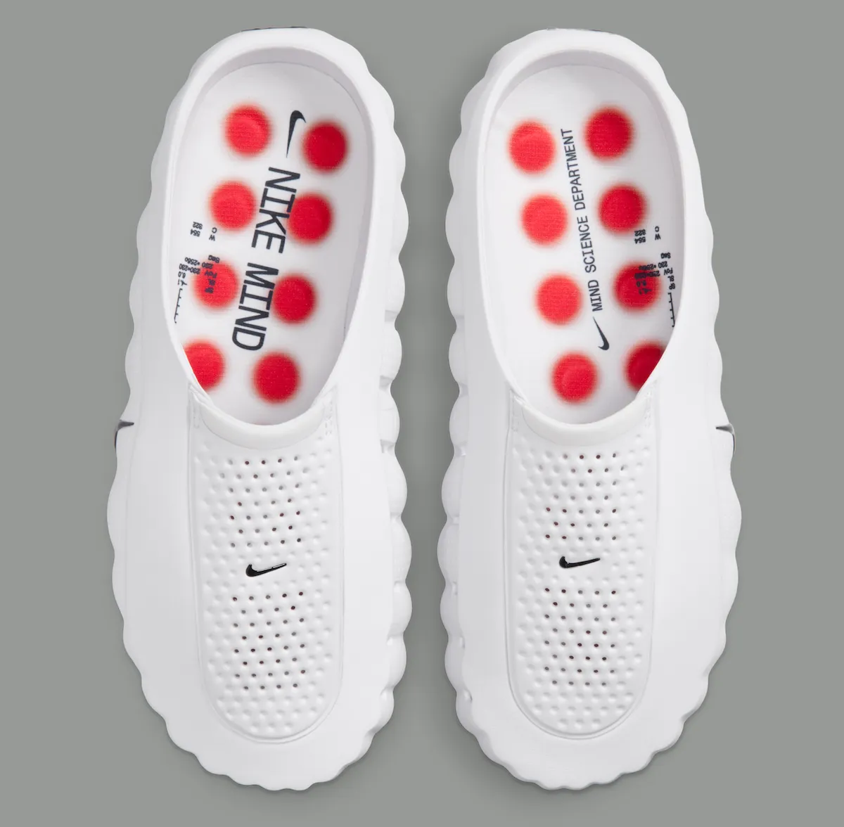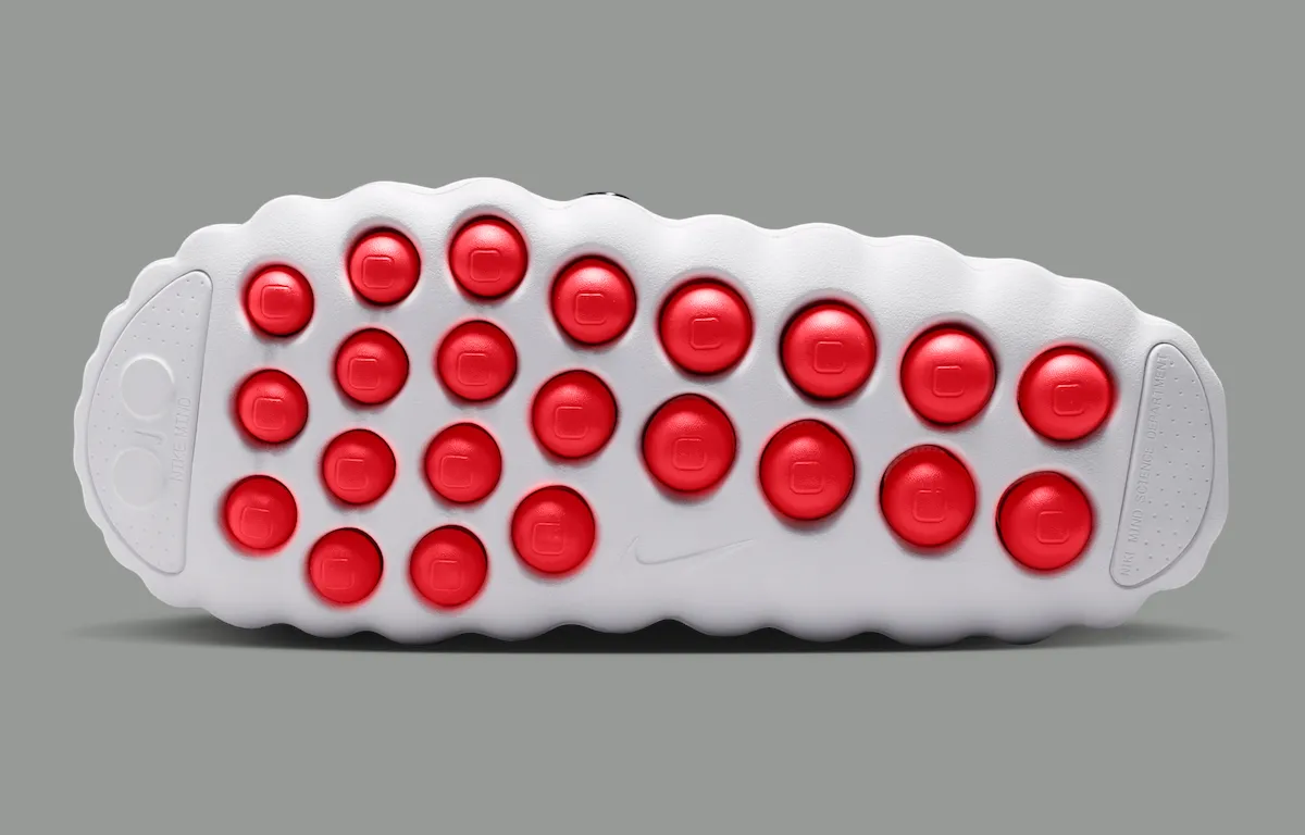 Underfoot is where the shoe’s most distinctive feature appears. The outsole includes bright Speed Red circular pressure nodes, engineered to activate specific points along the foot’s sole. These raised pods are central to Nike’s Mind Science concept and differentiate the model from standard comfort slides.