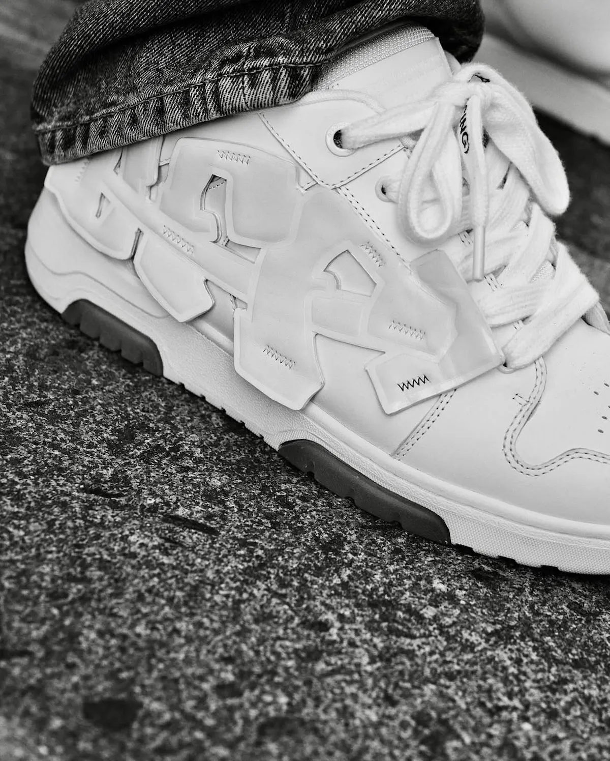 At the center of the collection is a white-on-white version of Off-White’s chunky Out Of Office sneaker. The skate-inspired silhouette keeps its bold, retro shape while adding subtle personal touches tied to Cudi’s identity. Clean tones dominate the shoe’s upper, allowing the details and collaborative branding to stand out without overwhelming the design.