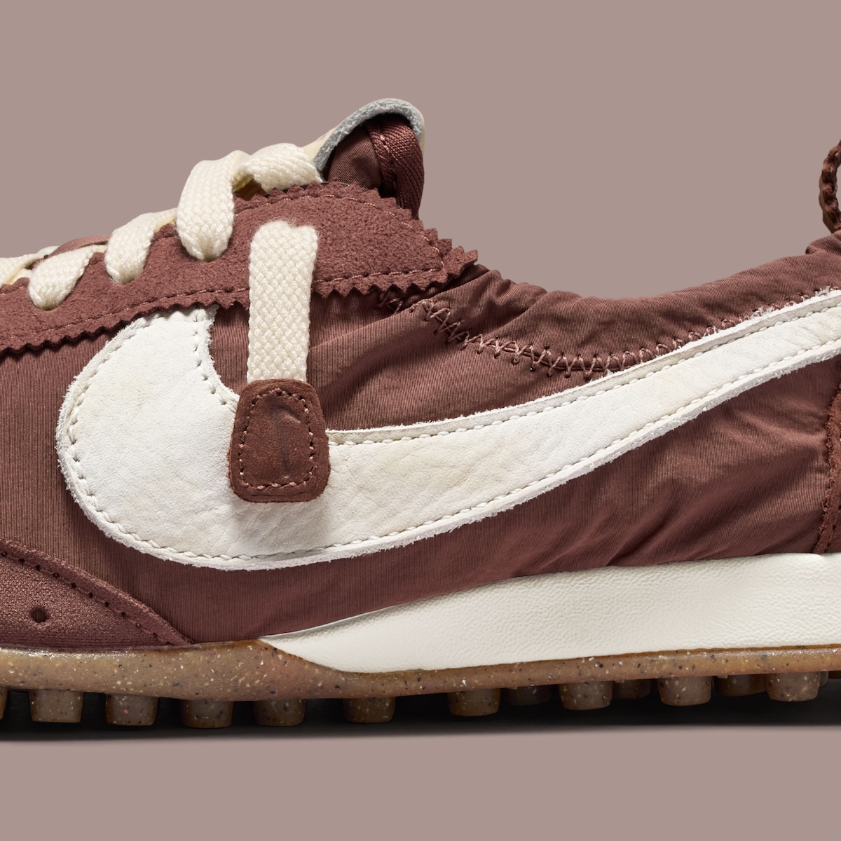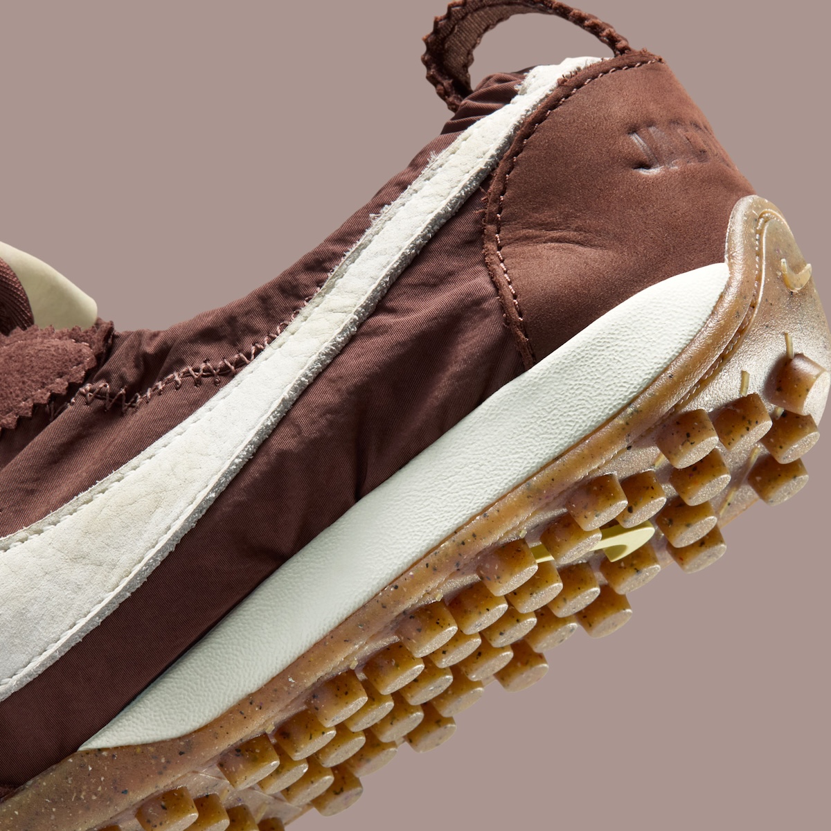 The upper is constructed of ruched nylon and soft full-grain leather pieces, coming together to create a deep brown color. The quilting across the toe box and midfoot create a softly sculpted look on the sneaker that feels new in a sea of conventional runners. Cream Nike Swooshes lace the sides while cream laces and minimal suede details help contrast the sneaker while keeping with the monochromatic theme. The silhouette of the shoe is true to form with a low profile and mimics the slim silhouette of the original Moon Shoe.