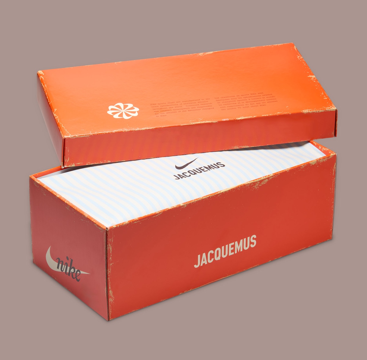 Branding stays minimal across the design. Jacquemus appears on the tongue, heel, and sockliner, while Blue Ribbon Sports-inspired packaging connects the release to Nike’s earliest chapter.