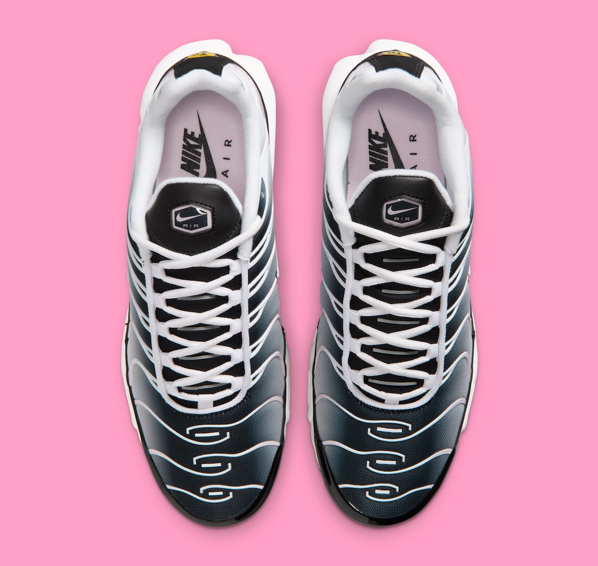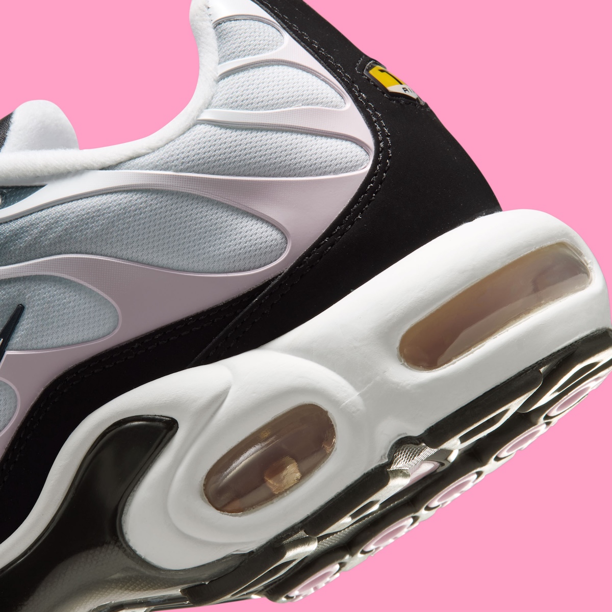 Up top, breathable mesh transitions gradually from black into anthracite as it moves toward the toe. The gradient gives the upper a slightly smoky appearance that changes depending on lighting. Running across that surface are the model’s signature TPU cage ribs, finished here in Pink Foam, tracing the palm-tree inspired lines that helped define the original Air Max Plus aesthetic.