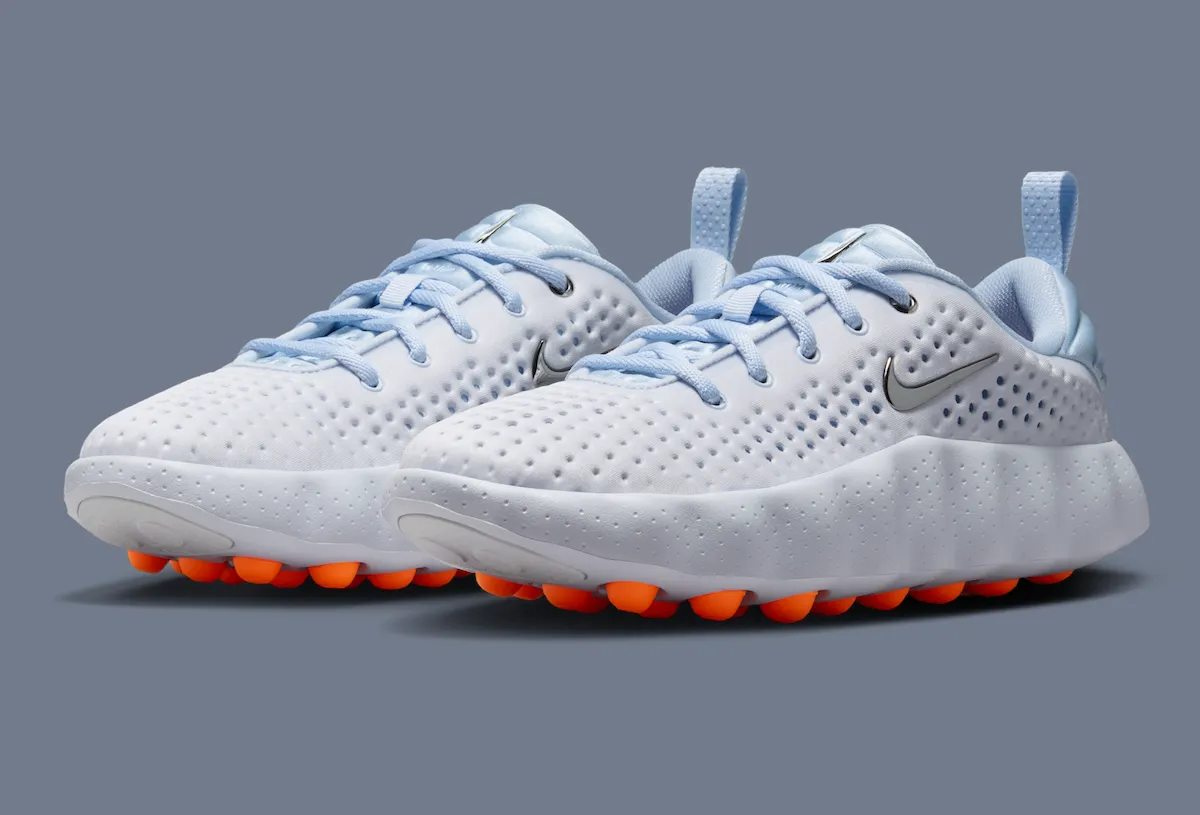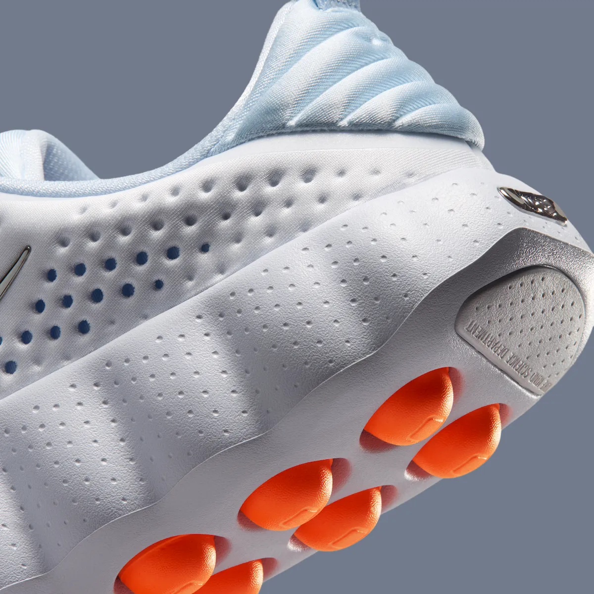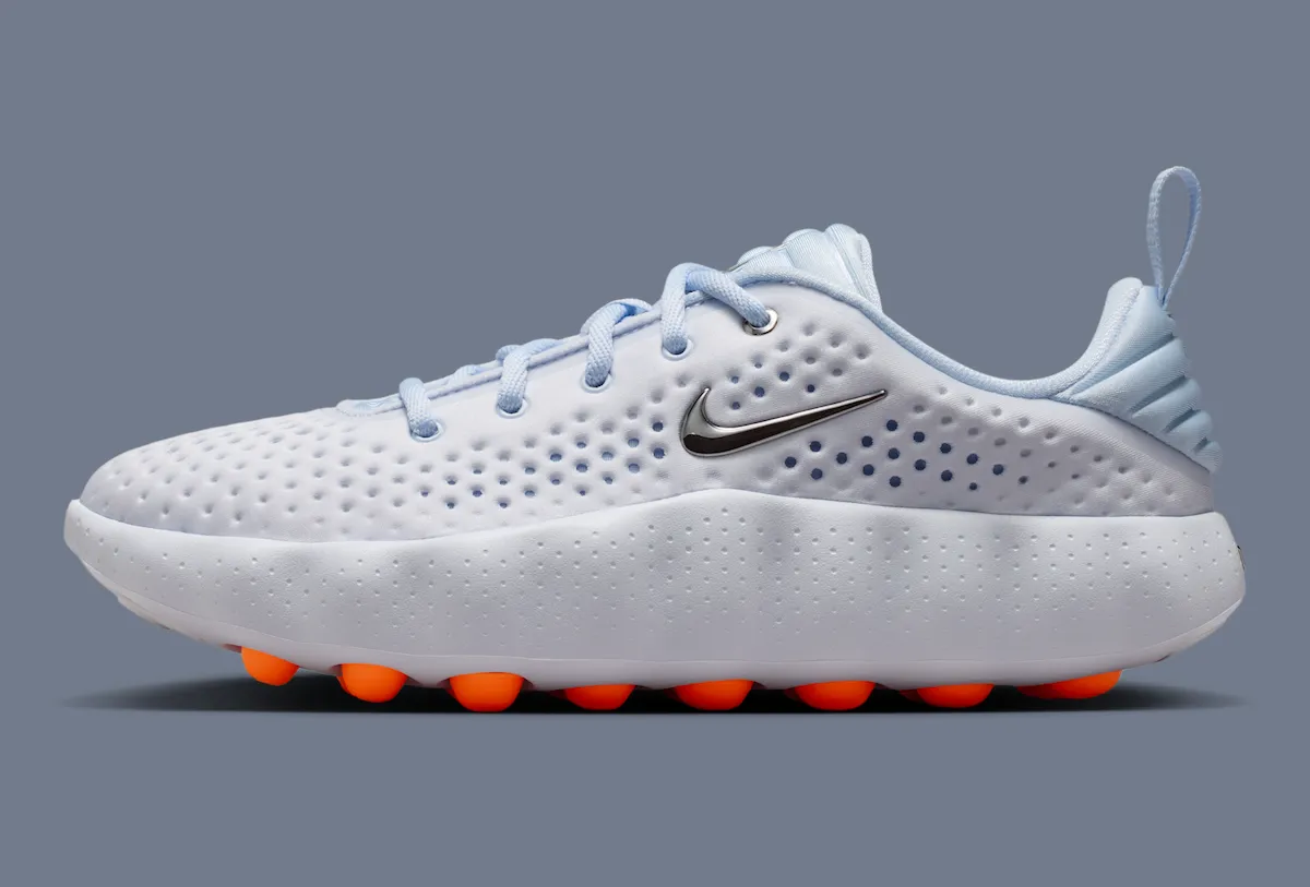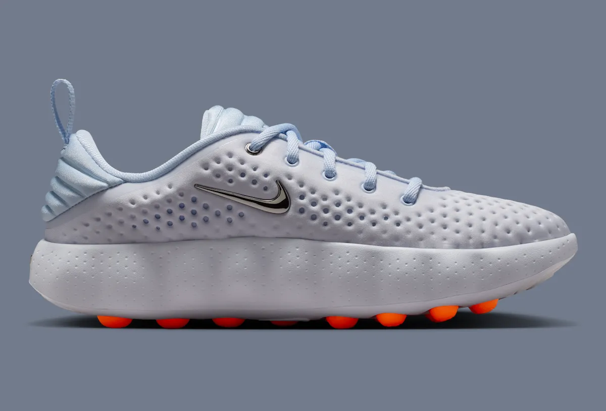 This women’s release features Football Grey covering the model’s textured, dimpled upper along with the sculpted midsole. Hydrogen Blue accents appear on the tongue, heel area, and inner lining, adding a cool contrast to the muted base. Chrome Swooshes introduce a metallic touch, while the sole unit’s signature spherical nodes arrive in Hyper Crimson, highlighting one of the shoe’s most distinctive design elements.
