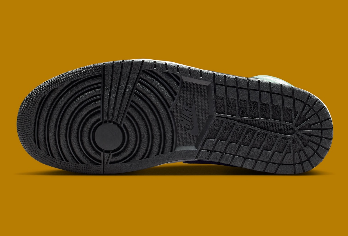 Look a little closer and a small detail shows up near the front. A tiny University Gold Swoosh sits embroidered along the forefoot overlay, adding a quick contrast hit. Underneath, a Summit White midsole meets a black rubber outsole, finishing things off with the familiar Air Jordan 1 traction pattern.