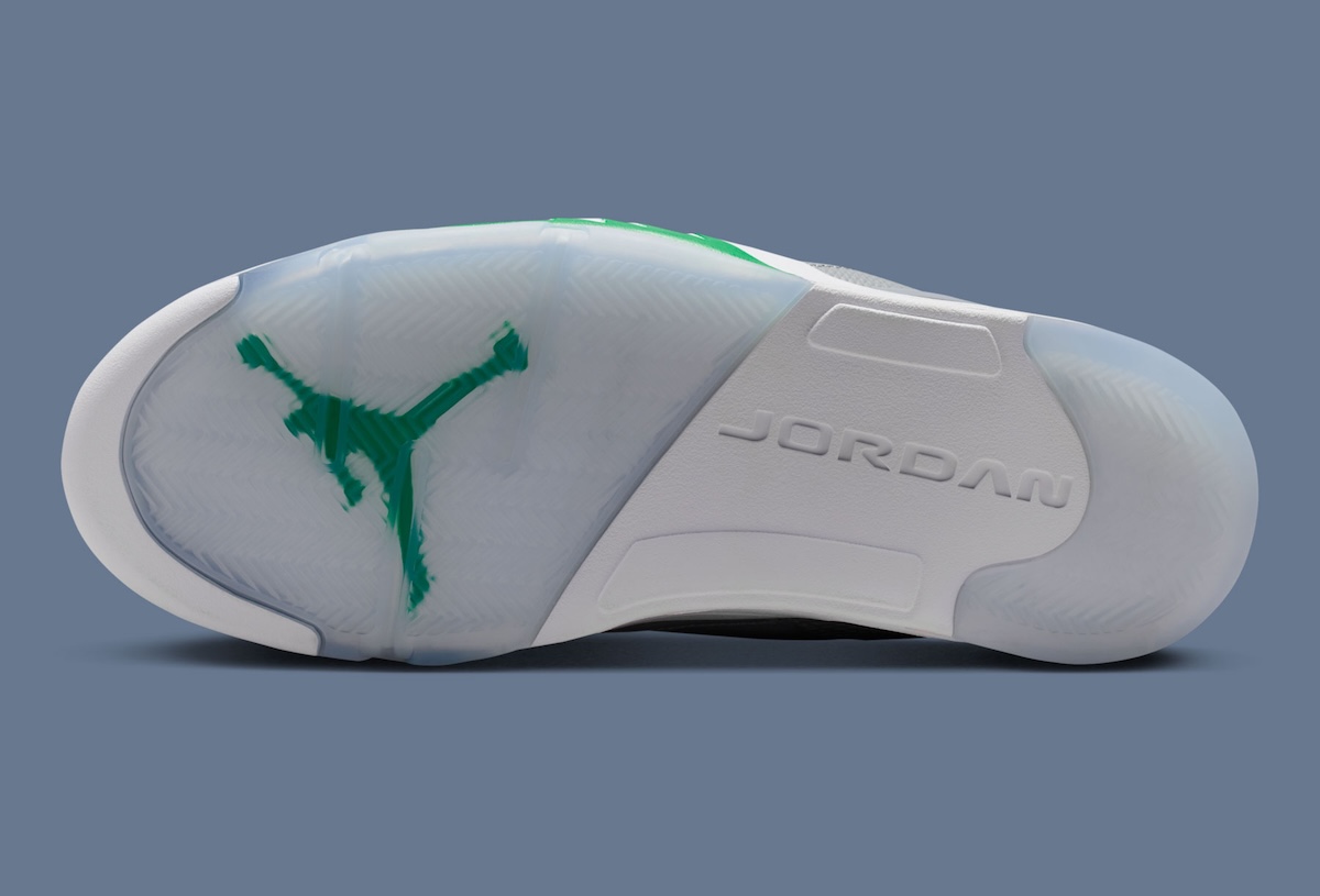Look underneath to find a white foam midsole complemented by translucent Air cushioning in the heel. A clear outsole caps the shoe off, showcasing a green Jumpman peeking through the forefoot. The Jumpman is stamped with “23” in the heel counter for an ode to Jordan’s signature shoe.