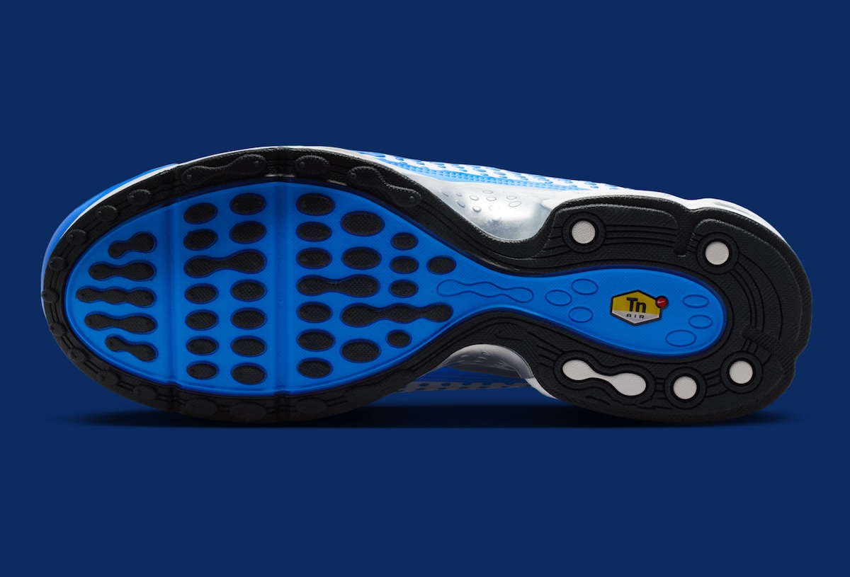 Classic Tuned Air cues remain part of the build. The familiar Tn Air badge appears on the tongue, heel, and outsole, while the midsole houses multiple visible Air units for cushioning. Blue-tinted Air windows tie the color scheme together, and a black rubber outsole completes the look underneath.
