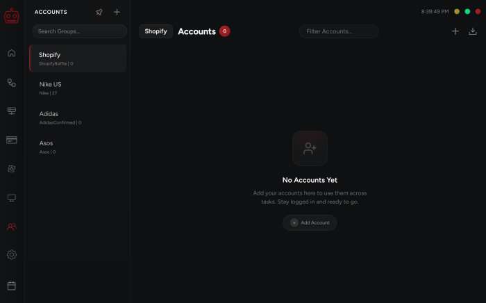 There are 8 types of accounts in this tab based on the site. Nike accounts to use for Nike SNKRS, Adidas accounts for AdidasConfirmed, Asos accounts for different Asos regions, and more including AliExpress, Walmart, BestBuy, and Shopify sites.
