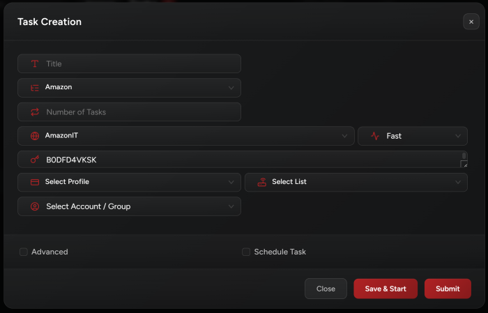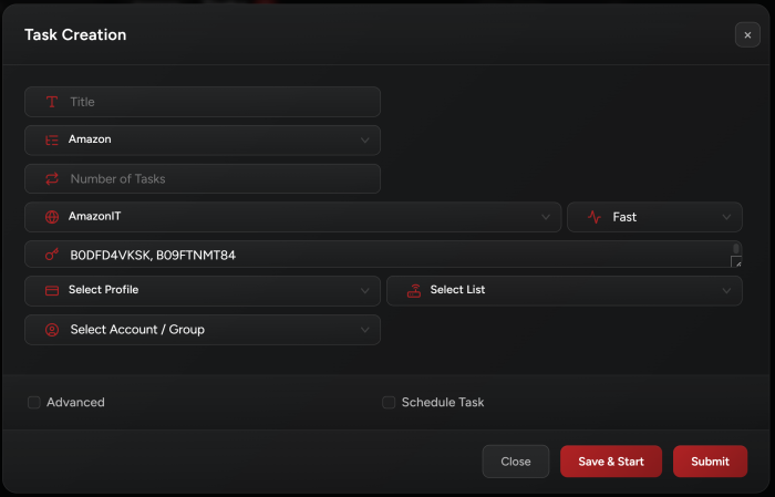 NSB will use account’s saved info (address and card) to checkout. Thus, you can’t select a billing profile when creating Amazon tasks.