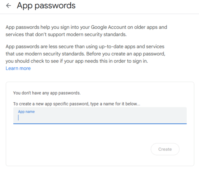 Step 3: Once 2-Step is enabled, go back to: https://myaccount.google.com/security, search for “app passwords” and click the first option.