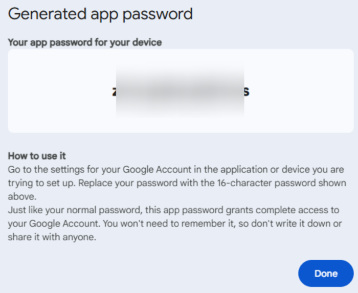 Step 5: Once done, a pop-up will appear with 16 characters. This is your IMAP password.