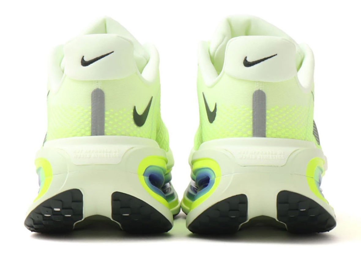 Beneath the upper, the platform becomes the centerpiece of the design. A thick Volt midsole houses responsive ZoomX foam paired with visible Air Zoom units stretching across the sidewalls. Those elongated windows reveal Sapphire-tinted cushioning that adds a cool contrast against the neon frame. Underneath, durable Black Spruce rubber forms the outsole, finished with a waffle traction pattern built for grip across pavement and daily training miles.