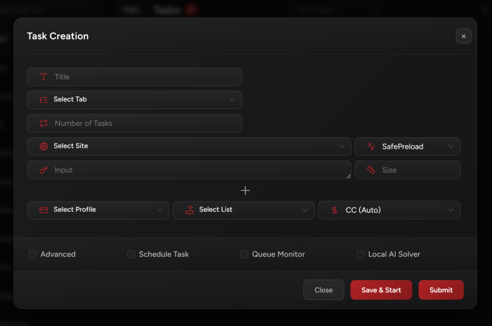 There are some site-specific options when creating a task, for more info about these options, check the guides under Site Specific Guides.