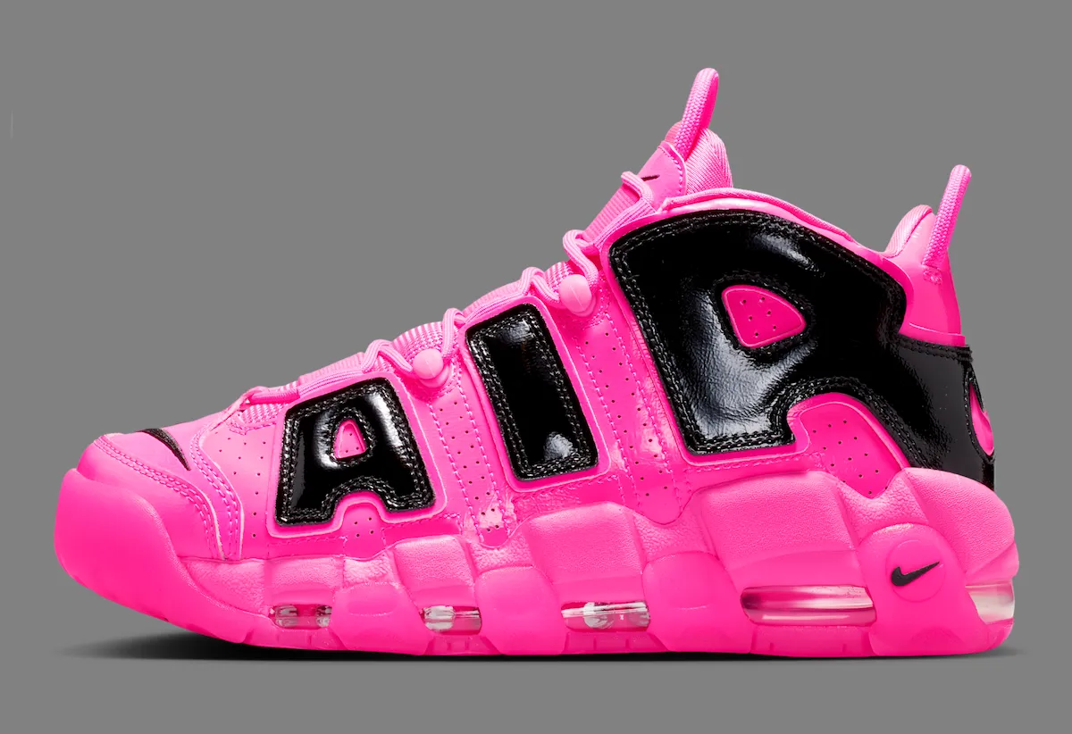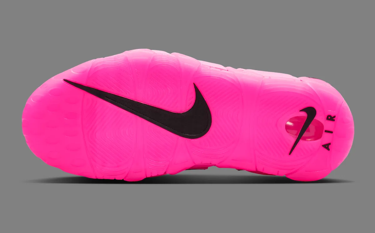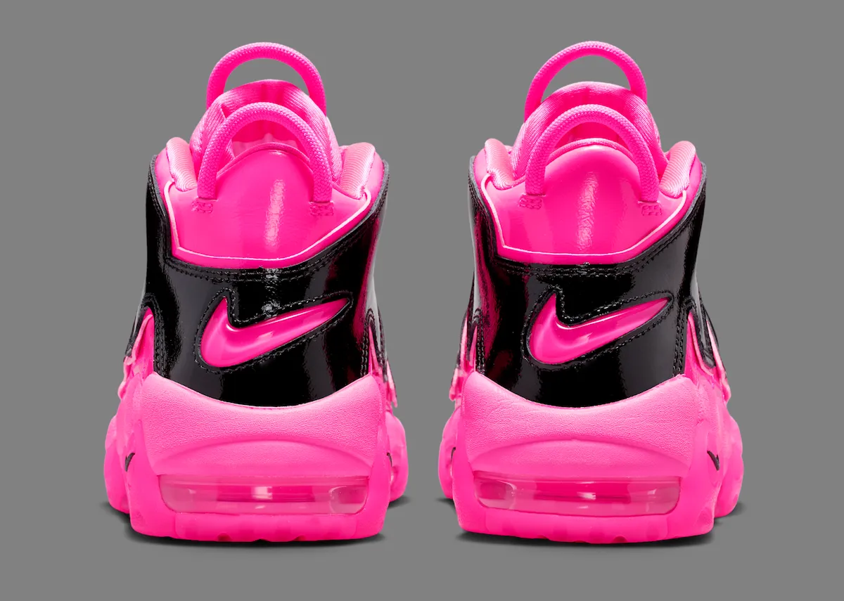 Additional black accents help balance the look. A mini Swoosh on the toe, matching heel branding, and darker midfoot details break up the bold pink color scheme. Underfoot, visible Air cushioning remains in place, maintaining the comfort and performance heritage that defined the Uptempo line.