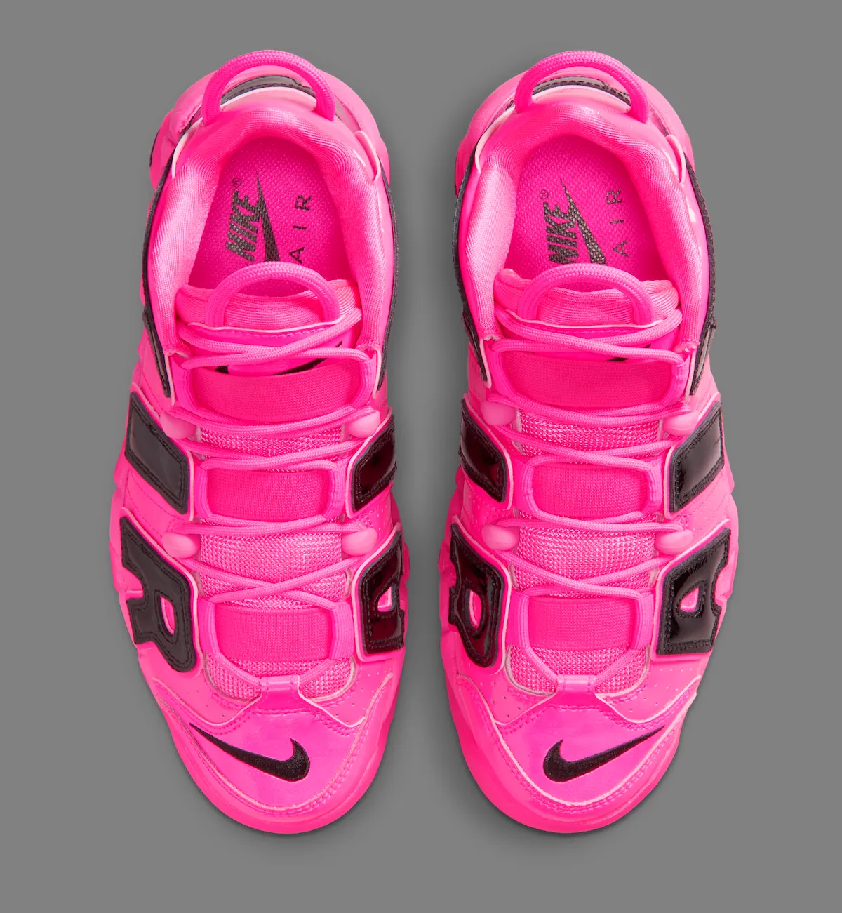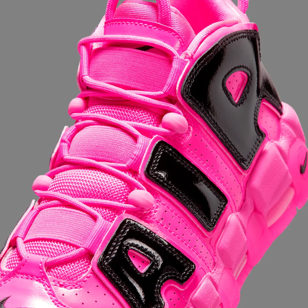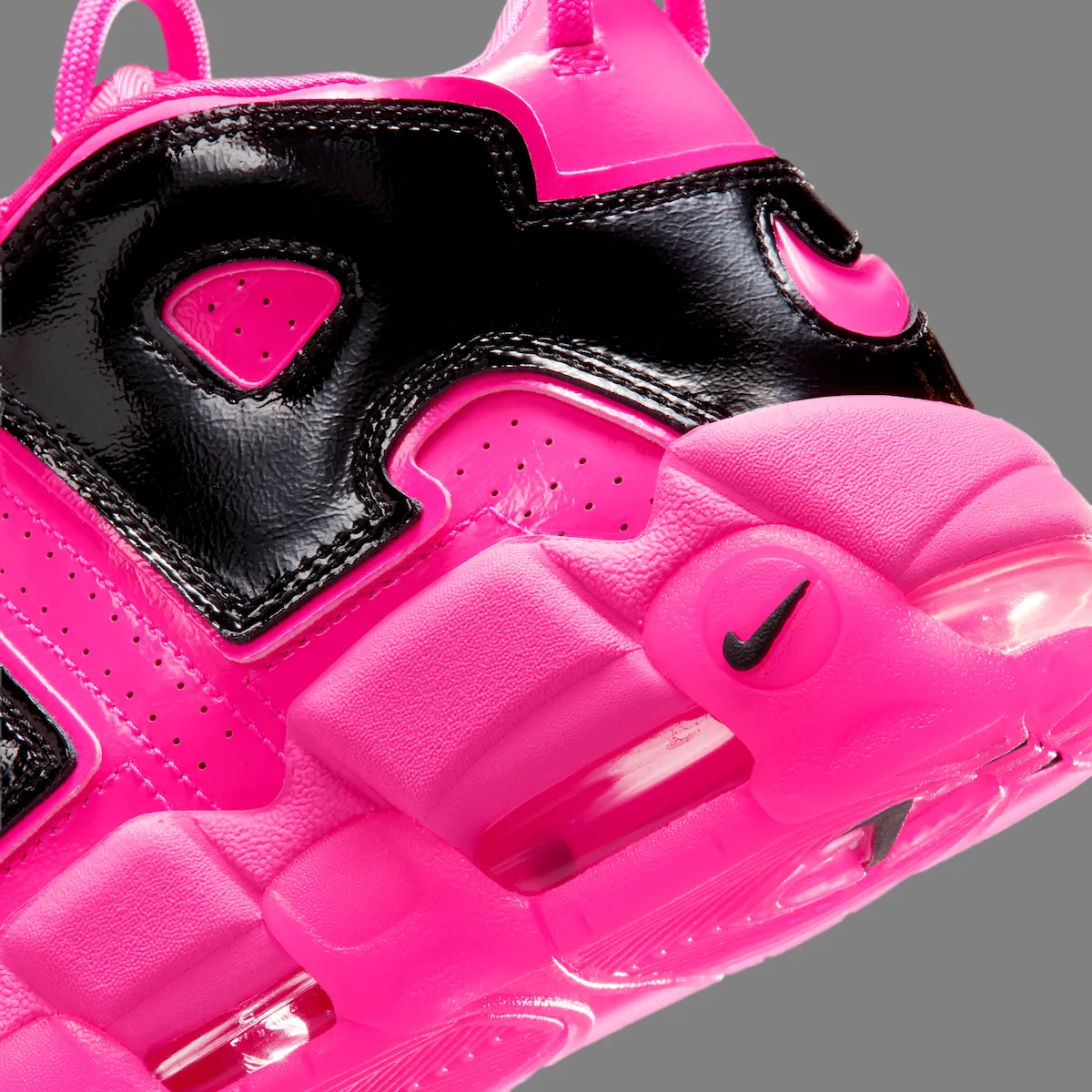 Additional black accents help balance the look. A mini Swoosh on the toe, matching heel branding, and darker midfoot details break up the bold pink color scheme. Underfoot, visible Air cushioning remains in place, maintaining the comfort and performance heritage that defined the Uptempo line.