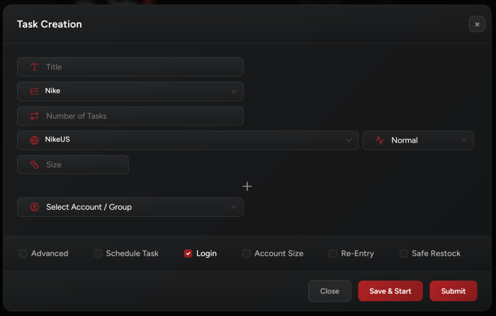 Loginoption should be selected. And you can add any Advanced options, or Schedule your task to Start/Stop at any time, or choose the Re-Entry option if you want your tasks to reenter upon checkout failure.Note: Beware that, for Nike tasks that are using accounts, the Tasks tab will show the billing profile and proxy that are assigned to the account, not the task. If you wish to edit a billing or proxy for those tasks then you can do so in the Accounts tab.