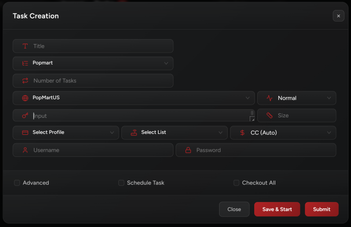 PopMart requires accounts. Make sure you add your PopMart accounts in the Accounts tab before creating your tasks.
