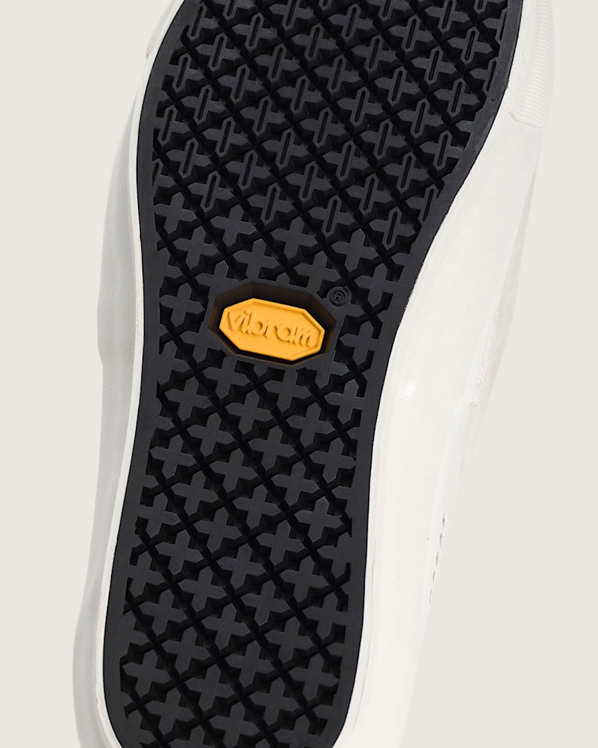 Down below, the classic waffle sole steps aside for a vulcanized Vibram outsole. The black rubber base carries Vibram’s yellow badge and a geometric tread pattern designed to improve traction while keeping the Authentic’s low profile intact.