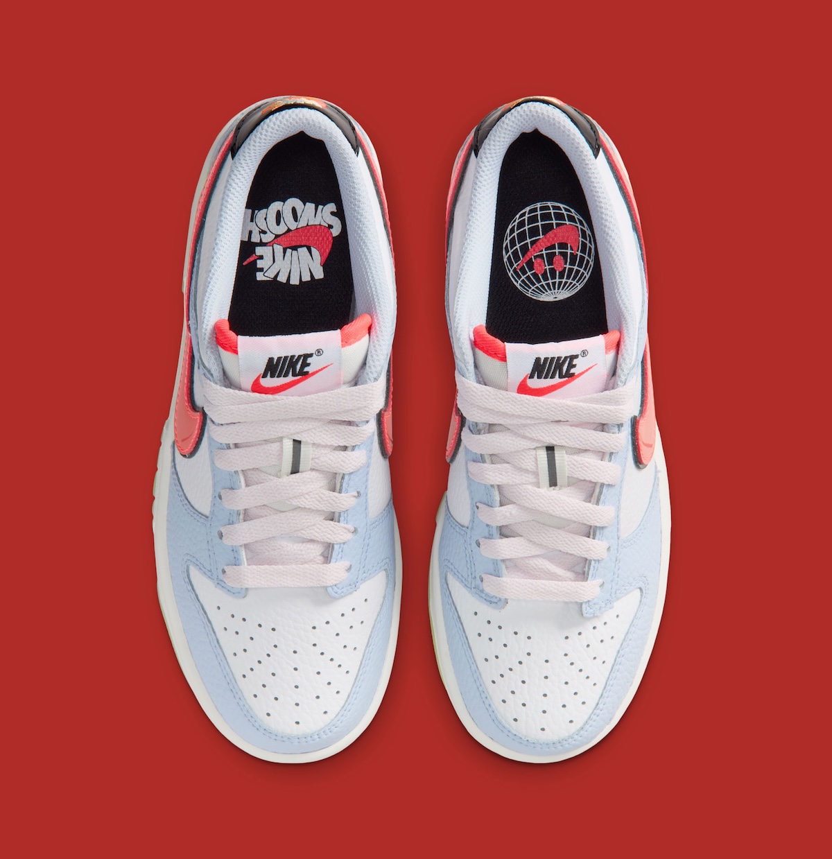 The top half of the shoe meets up with a pastel concoction. White leather starts us clean through the sole before powder-blue overlays take over at the toe, eyestays, and heel panels. To separate things up a bit, a coral Swoosh slides down the lateral side cutting through pastels while delivering a punch of color.