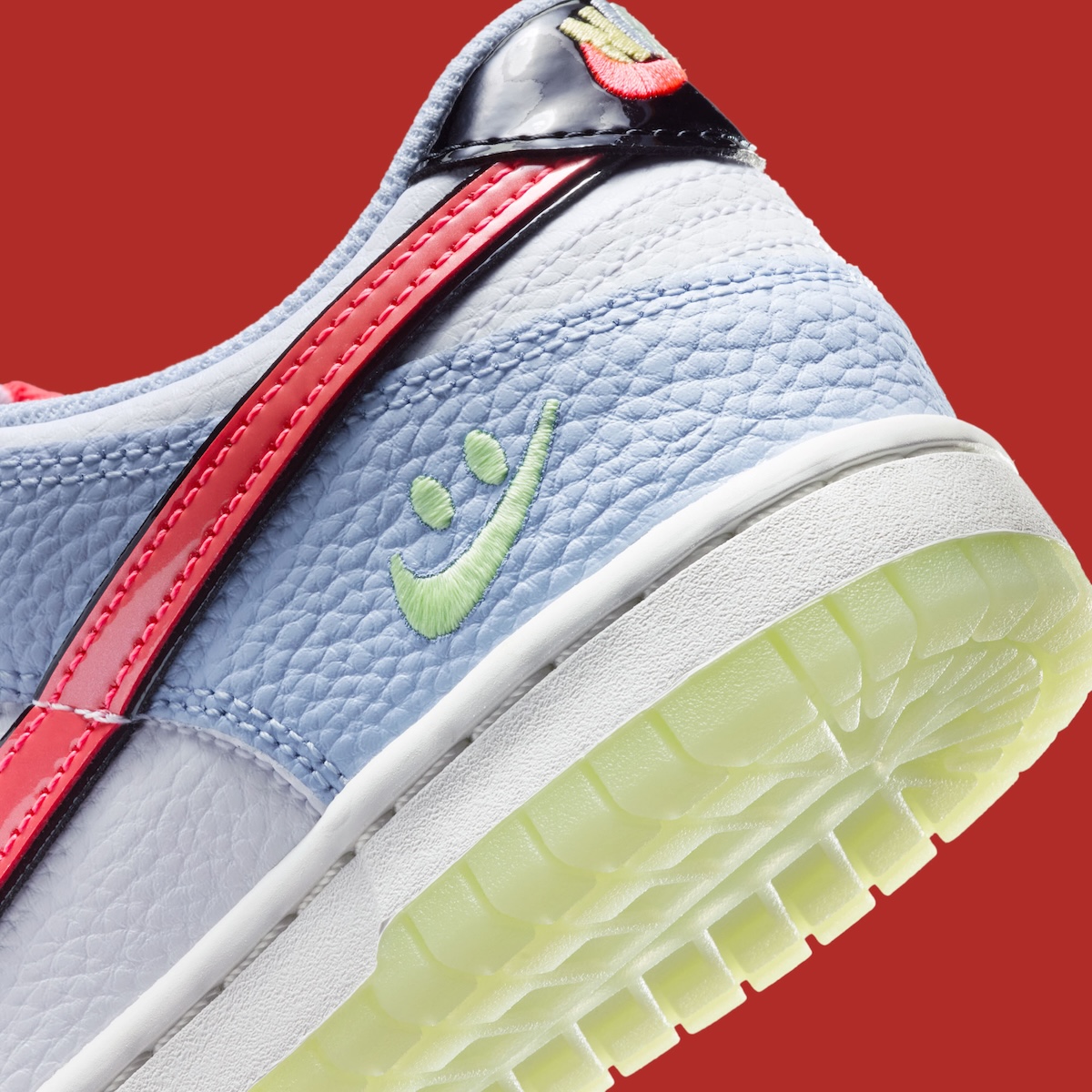 Small detailing near the heel is what really gives this pair character. Nike actually embroiders a Smiley Swoosh in hot neon green along the lateral side of the shoe. It isn’t too big or overbearing, but it is noticeable enough to allow the Dunk to have an identity. Nike applies themed graphics on the inside lid of the shoe which is a more subtle way of carrying that playful theme throughout.