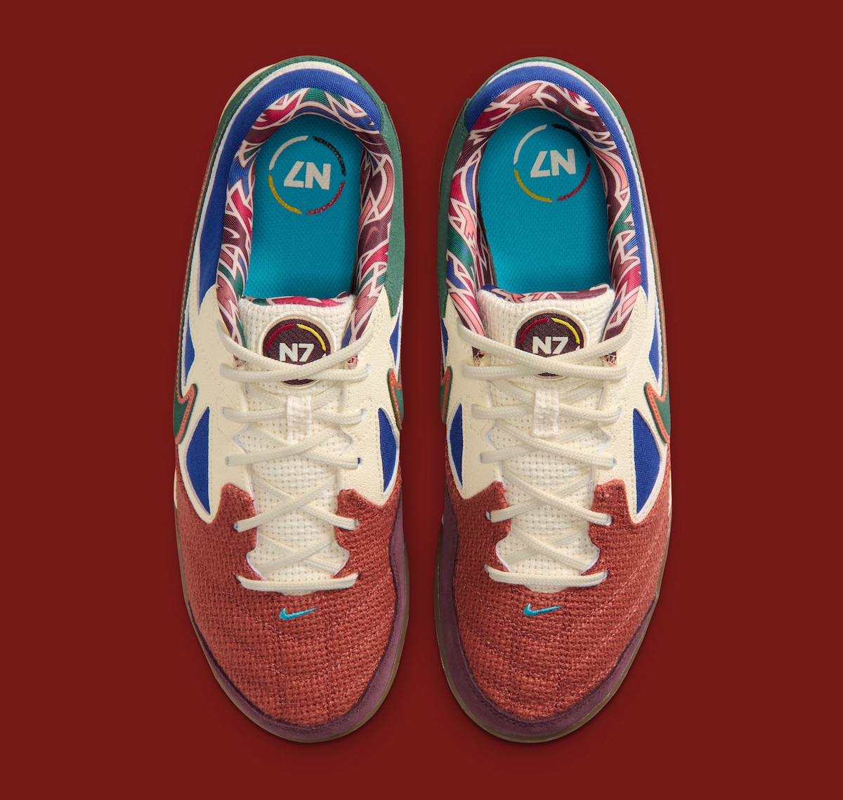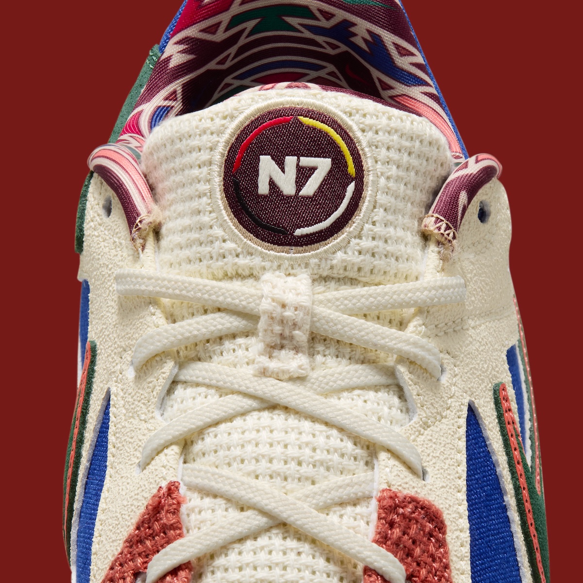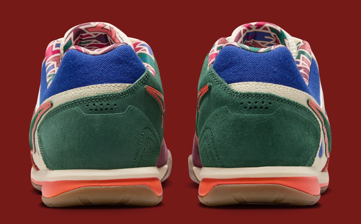 Moving toward the heel, green suede takes over and lines up with the Swoosh along the side. That Swoosh gets a thin burnt orange outline, tying it back to the forefoot without being too loud. Inside, the sockliner features a bold pattern, and the N7 logo on the tongue keeps everything connected to the collection.