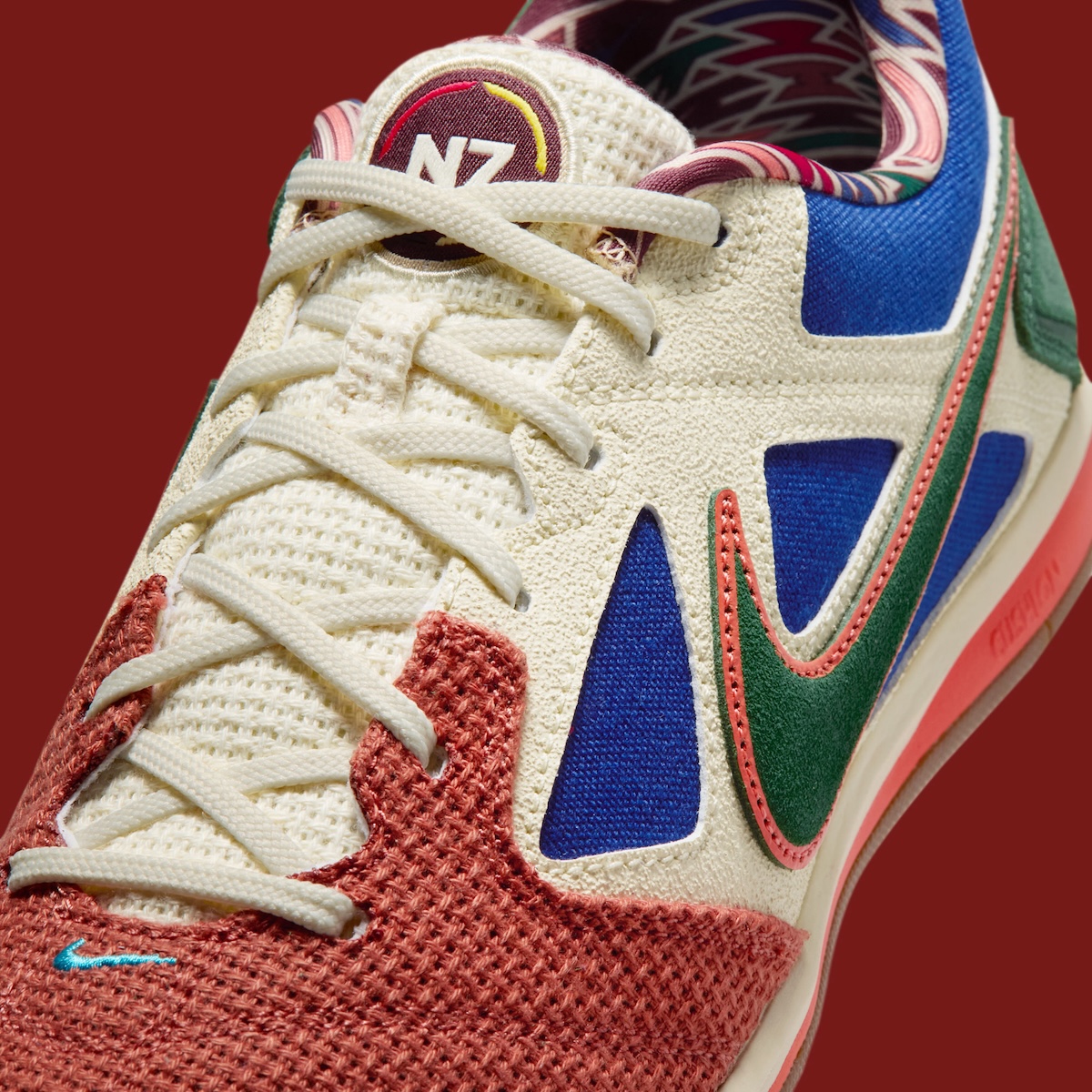 Starting with the toe box, the Gato N7 features a maroon suede wrap that transitions into an orange-red knit upper for a fuzzier texture. Located by the toe is a diminutive blue Nike Swoosh that is easily overlooked. Cream suede and mesh panels run laterally across the upper and deep blue canvas overlays are used to fill-out cut-outs and collar.