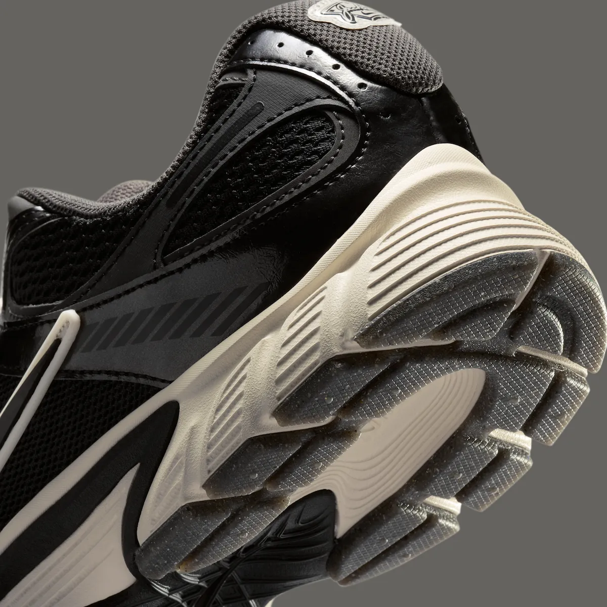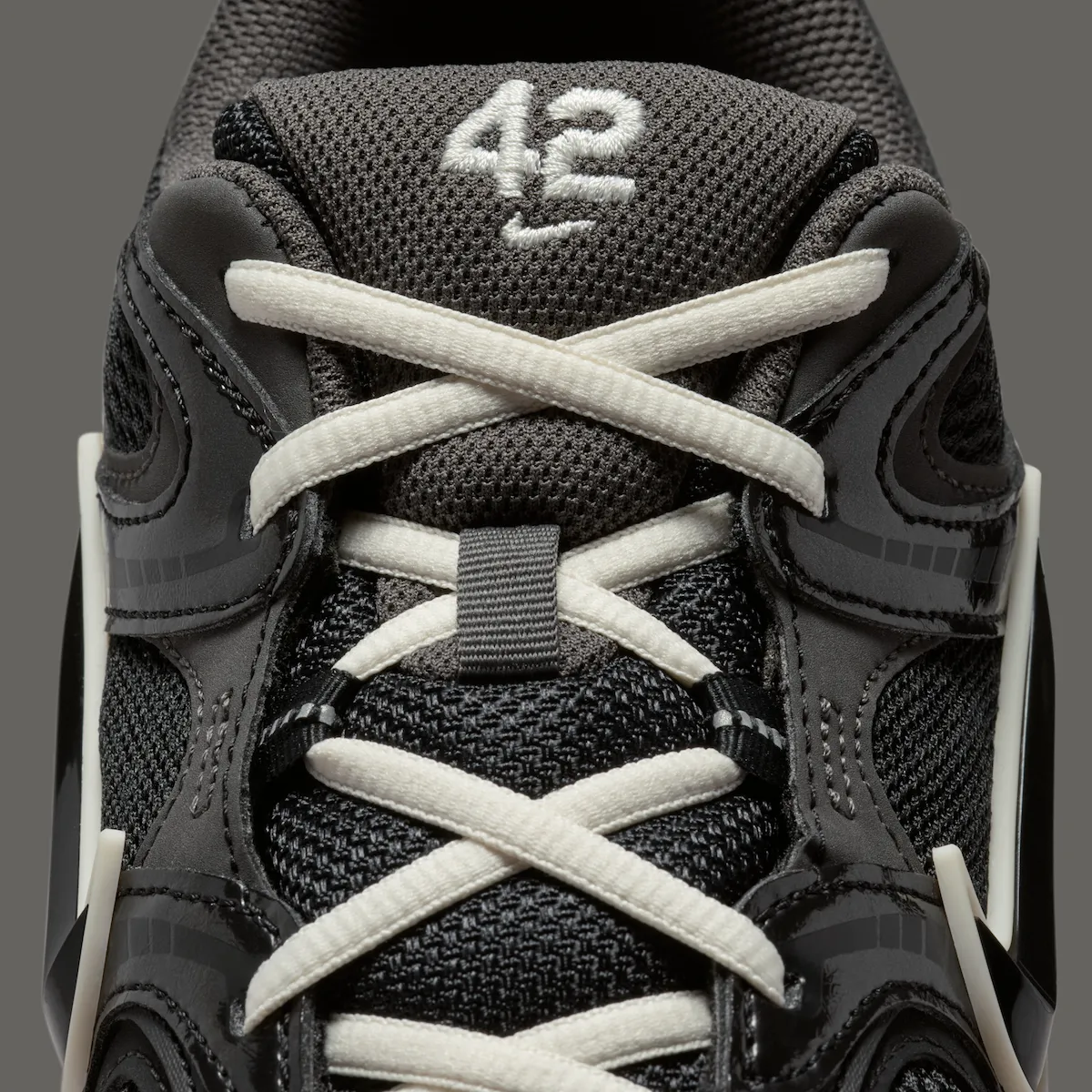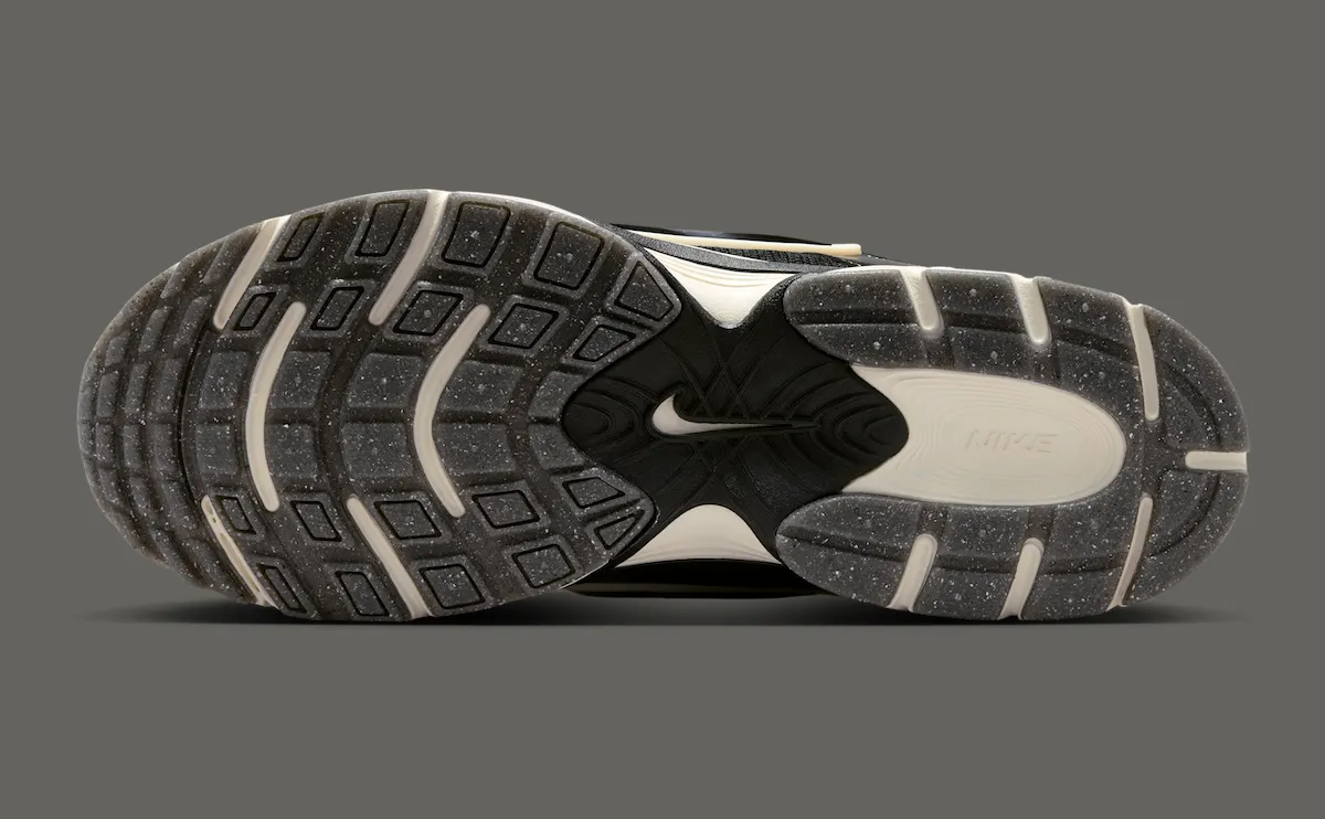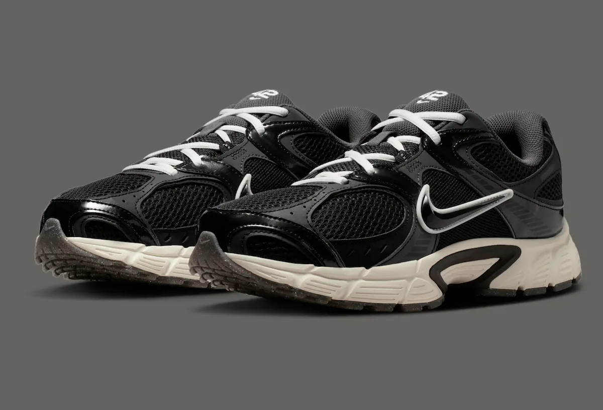 The pair keeps things understated with a black leather and mesh upper, paired with a glossy patent leather toe and supportive overlays. White accents hit the laces, branding, and Swoosh backing, creating contrast without overpowering the design. Underfoot, an off-white midsole softens the look, while a speckled black outsole adds a slight baseball-inspired touch.